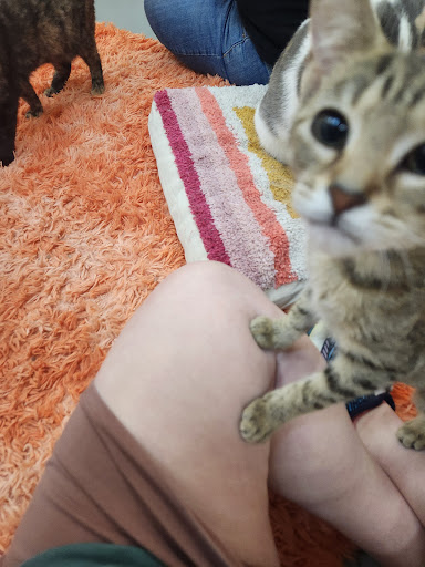 Read moreWe scouted the cat cafe after losing our older cat. We had two girls in mind that were available and thought either would be Purrfect. The next evening, we got approved and brought the whole family. An altogether different cat 'Snuggles' chose us by curling up in my husband's lap exactly like our old cat. She's a small 2y/o gray tabby who'd been in foster, then in the cafe the longest. She has quickly become an amazing pet for us and came pre-socialized. She set some boundaries with the loud bossy dog, loves to sit in the afternoon window sunshine and give you purrs and wet nudges every day. She wakes you up by sitting on you and purring in the morning, has her evening zoomies chasing her pompom, then will stare at you when it's her bedtime cuddle time. We've named her 'Little Sister'. You should visit the cafe'. A Perfect Cat will Choose you Too! They're never wrong, she's exactly...