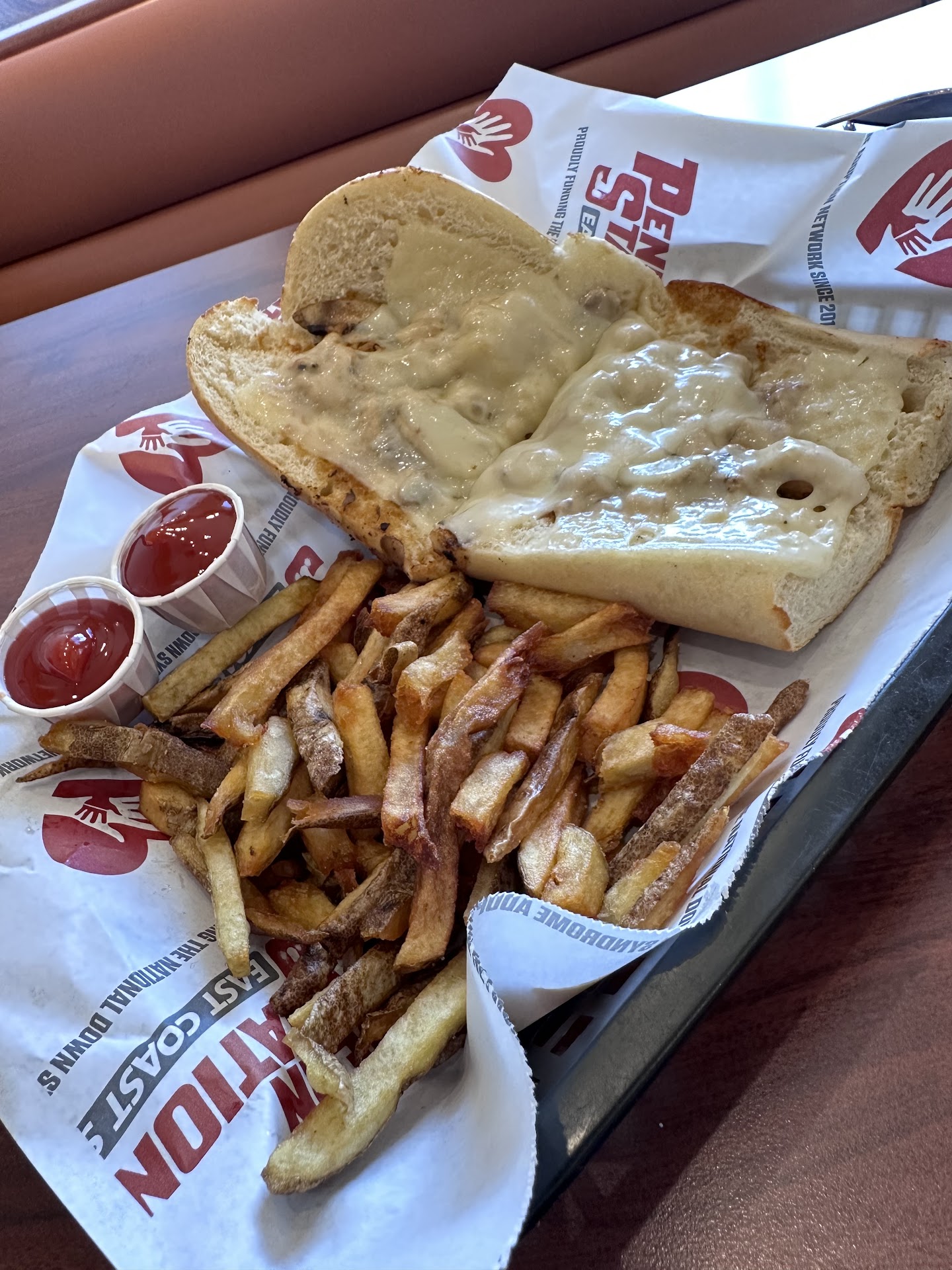 Read moreI would visited this penn station once on my work break and this penn station made me fall in love with penn station again. The sandwich was cooked perfectly and I asked for heavy on the mayo and they put on just the right amount on every time😍. I even tried going to other penn stations like the one on 10th and shadeland, the one in Ripple and the one in Castleton, but none could even come close to the tatse. Their sandwiches aren't super salty like the other Penn Stations seem to be. Every cook I had cooked the sandwiches perfectly and the fries were hot. They mostly seemed very understaffed. I usually only see two workers mostly working but they always treated me very well. I would order ahead to give them time to put a lil extra love into my sandwich. Then when I arrived, I would go next door to flying cupcake 🧁 😋 to enjoy a strawberry 🍓 🧁 (which are amazing 👏 👏 best ones in the city hands down) just to give them a lil extra time on my sandwich. Ur not living life till u had both of these treats. I HIGHLY RECOMMEND BOTH 👌 Best thing about this penn station is that it's very clean and won't have u sick on the stomach or running to the restroom after u annihilate their Philly...