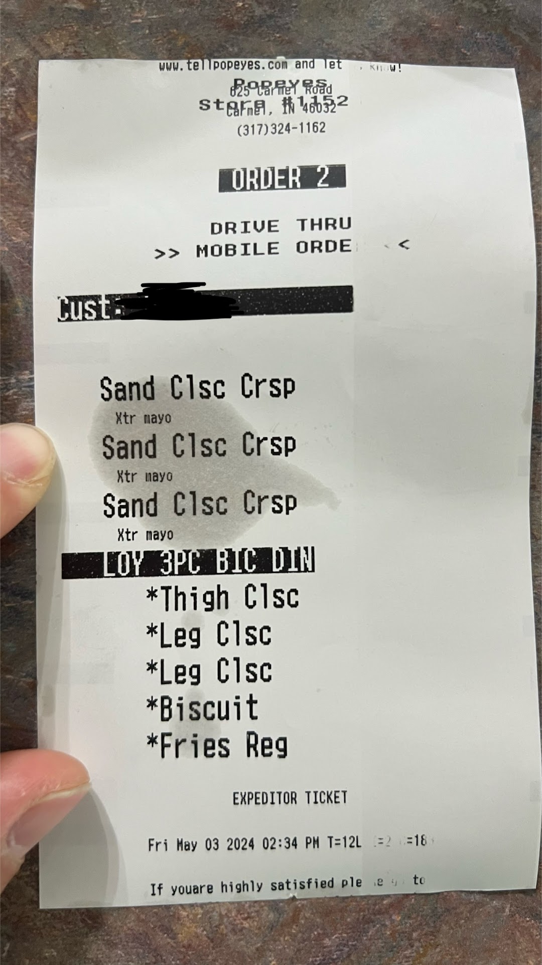 Once we sat down I noticed one of the pieces of chicken they included in my four piece was about the size of my thumb. I’m really patient & even keel so I wasn’t going to make a scene in a Popeye’s about some chicken & beans/rice.