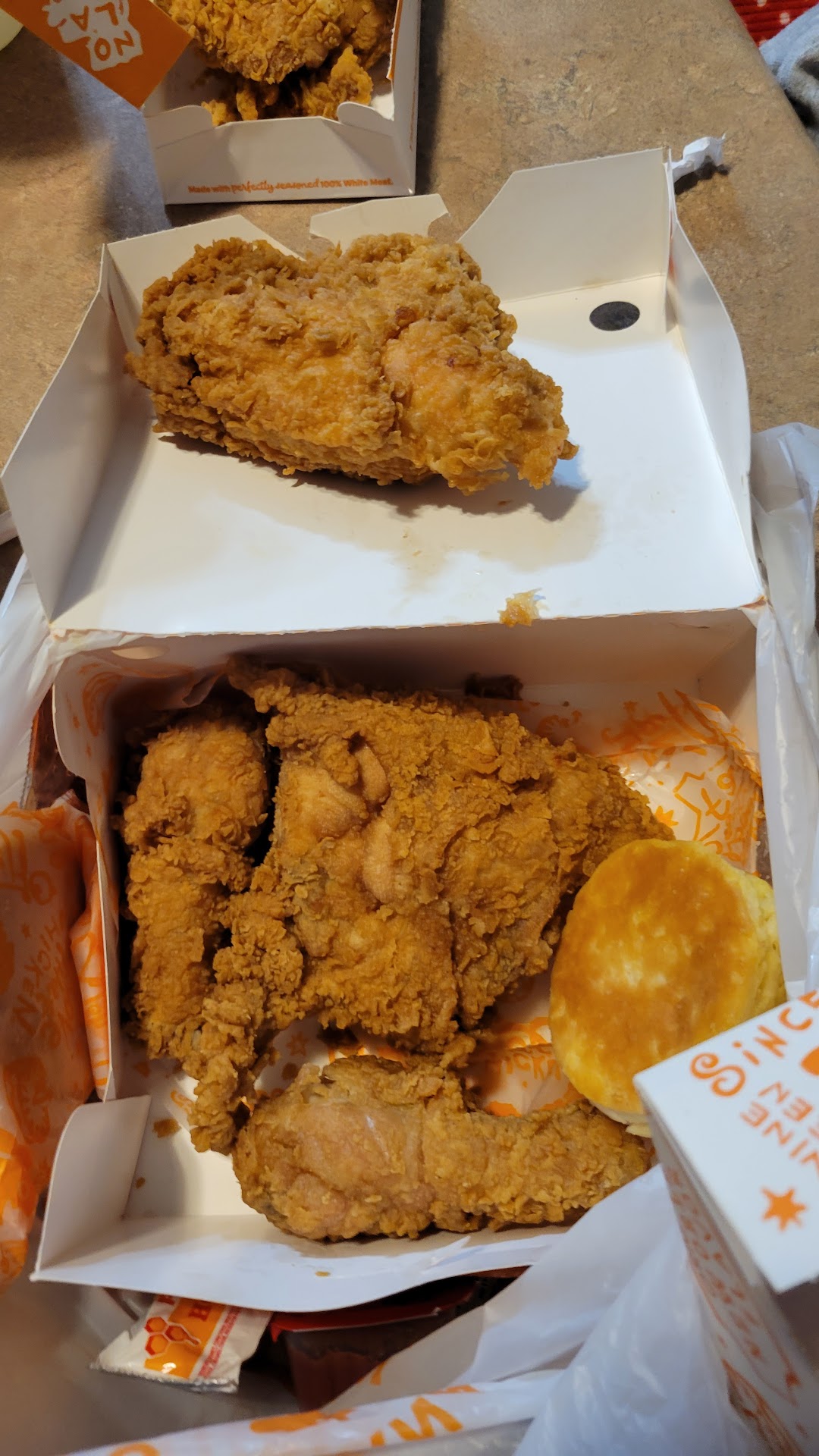 The person four orders behind me ordered a large bucket or whatever of chicken, they told him it would be about 15 minutes so they offered him a chicken leg for the wait.