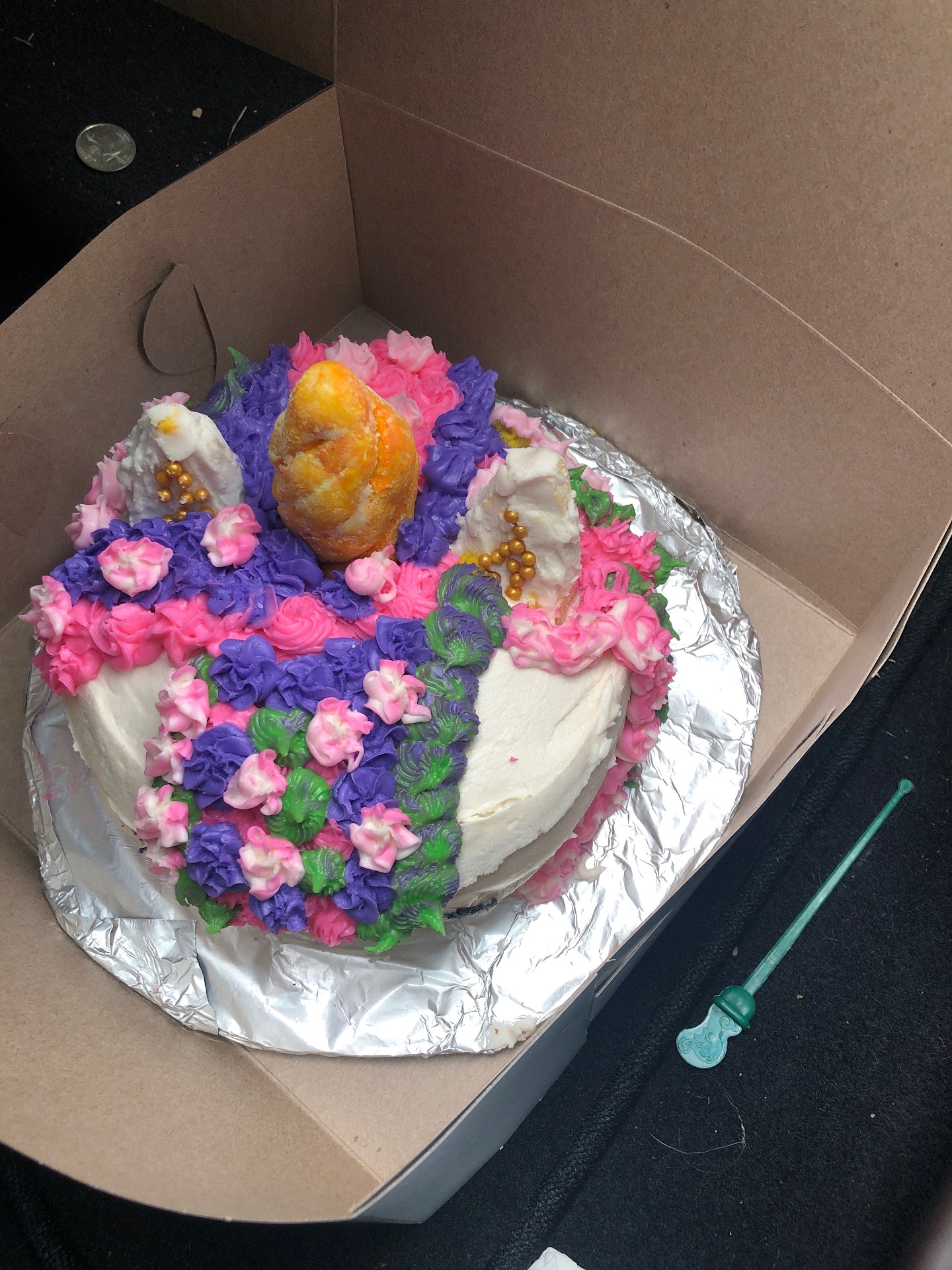 I purchased a birthday cake from her for my daughter and it didn't make the ride home. It cracked and fell apart completely as shown in the pictures. The next day was a holiday weekend and she told me she would not be working. So I figured I would talk to her when I returned a tote she loaned me.