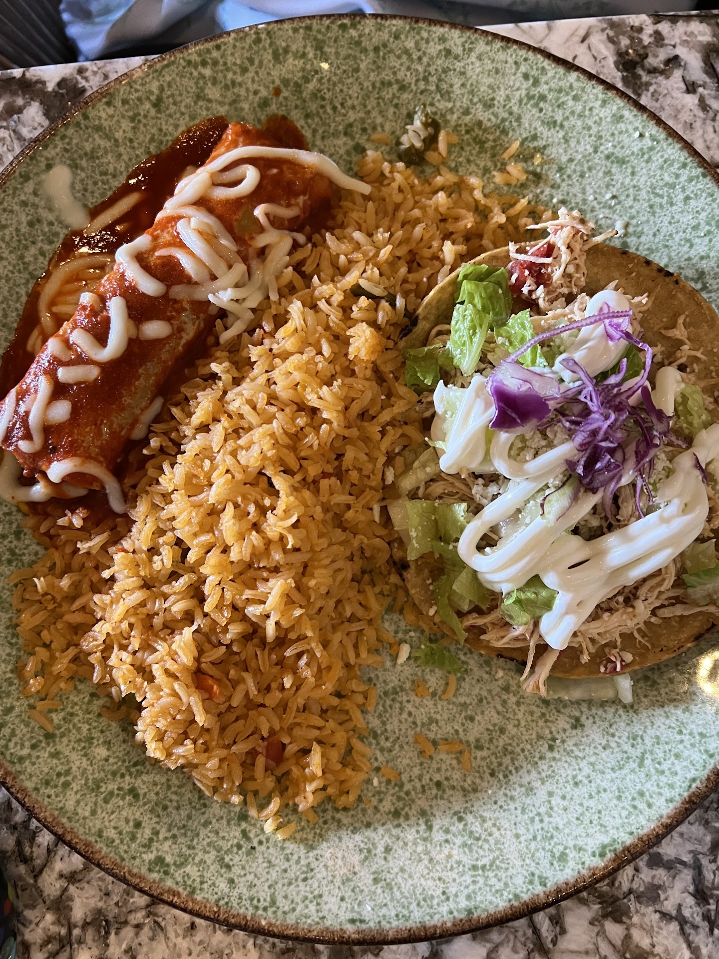 The enchilada tortilla was floppy and undercooked - which overtook any of the flavor the unseasoned ground beef could have had. The tostada was a highlight with the crispy tortilla, but the chicken could have legitimately come from a can. It was unseasoned and dry. Likewise, my chicken quesadilla was sized from the kids menu and dry even with the Papa John’s stuffed crust cheese flavored cheese all compacted in the crease of the tortilla. Finally, the burrito had one single onion sliver in it (not sure if it even supposed to have onions), the beans tasted like blended turkey from Thanksgiving, and the rice was unseasoned as well.