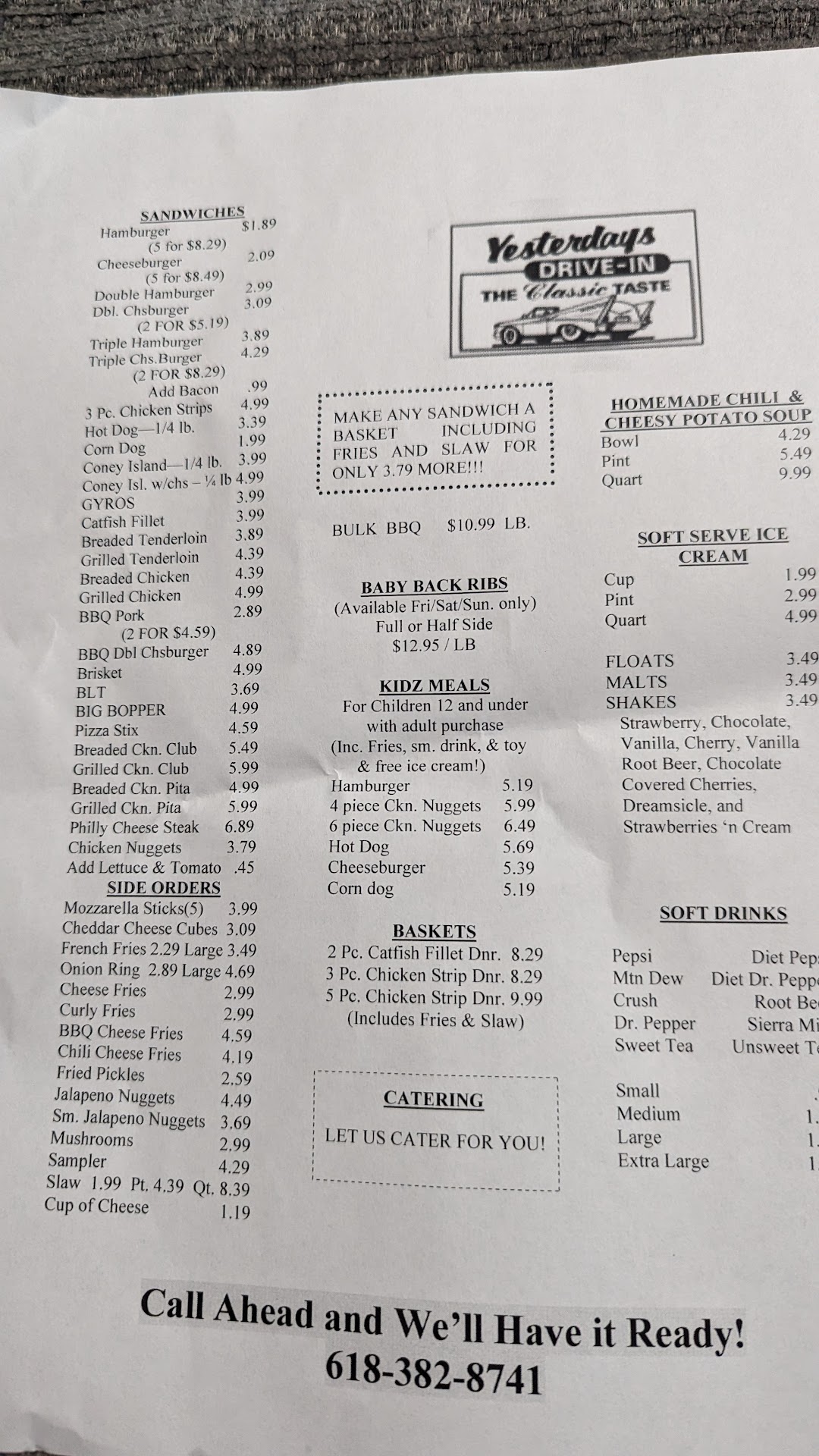 Read moreYesterday's has never pretended to be anything it isn't. The food is hearty and greasy, tasting exactly like you expect. Some people don't like it, but they're usually expecting the flash of a cooperate restaurant. This is a small business in a smaller-by-the-year town. It's a hole in the wall in a lot of ways, and that should earn it a badge of honor in and of itself. The car hops work hard and deserve every tip they get and more. Considering all food is made fresh to order, start to finish, they're incredibly quick. You may get on the road faster going through a fast food place; but if you're hoping to slow down a step and enjoy your meal, even though you still have somewhere to be, Yesterday's provides that option. To me, there's 4 (still open) businesses that are synonymous with life in Carmi. 1) DiMaggio(specifically the Carmi location). 2) Yesterday's. 3) John Brown Melons. 4) Little Giant. Whether you're from Carmi or just stopping through, Yesterday's is a spot you just can't...