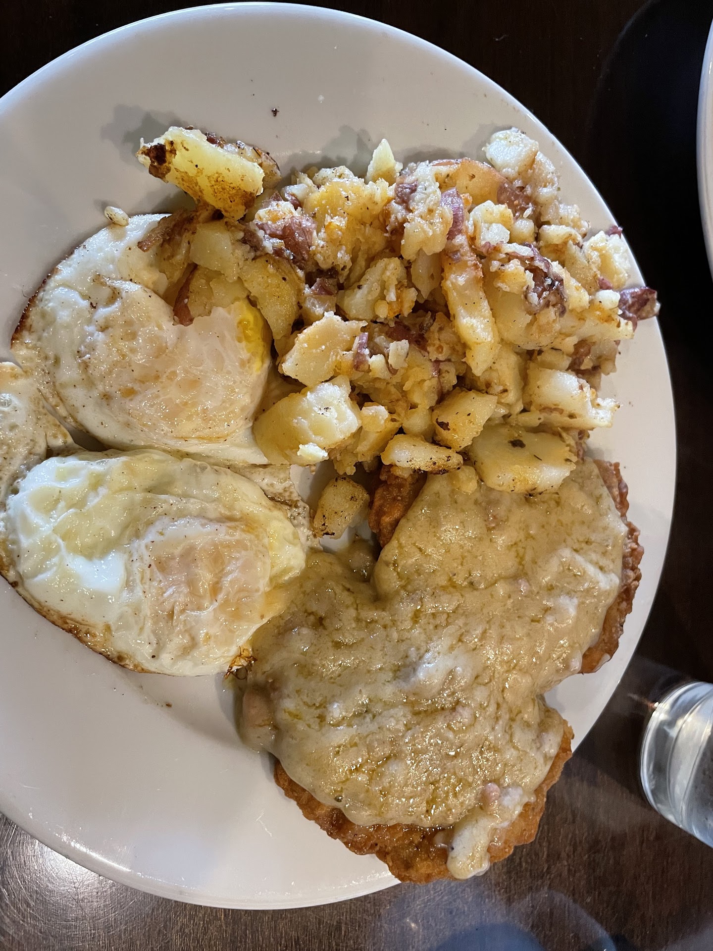 I had business in Carnation so I went early to grab some breakfast. Carnation Cafe had good reviews and nice photos so I thought I’d give in a try. As I pulled in I was a little bit surprised by the general appearance of the building. It seems to need a refresh. After parking I made my way to the door which was surprisingly dirty for 30mins after opening. This is normally a red flag for me and I go elsewhere but I had no time to spare. Interior is also a little tired although I was momentarily distracted by the pastry case which looks very promising. They were not yet busy so there was no wait. I was sat at a step up booth with taped up seats. I enjoy step ups for an elevated view of the dining area. I was greeted in timely fashion by a pleasant server who offered coffee/drinks. Coffee and water came out quickly but needed to have the water replaced due to several lip marks on the rim of my glass. Coffee was good and maybe slightly better than most cafes. I ordered the chicken fried steak and eggs and substituted a pancake for the biscuit without issue. My order came out quickly but was terribly prepared, especially considering there were only 4 other groups all with their meal in front of them. The gravy was broken and not very pleasing to the eye. My over-easy eggs were over-medium on the way to over-hard. The chicken fried steak was over cooked with a slight bit of gristle and the potatoes were mushy. My pancake was over cooked and dense, impenetrable by butter or syrup.