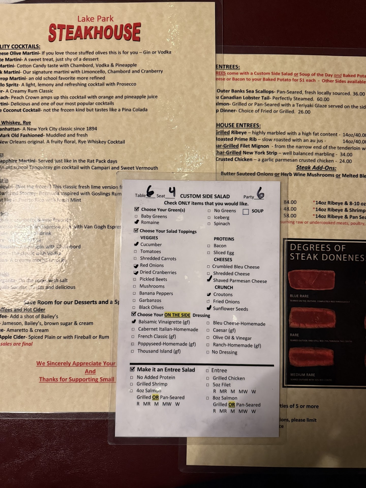 Out of Towner’s here…from Hampton and Poquoson, VA celebrating a friends 40th birthday and traveled down to Carolina Beach to share in the festivities with a friend who had moved to the area. We were going to be eating out the Air BNB but while one of the friends on the trip travelled around that date site seeing, they came upon the distinct smell of steak being cooked and the plans changed quickly…SO GLAD THEY DID. The group rallied around the idea of steak that evening and he made reservations for us at Lake Park Steakhouse.