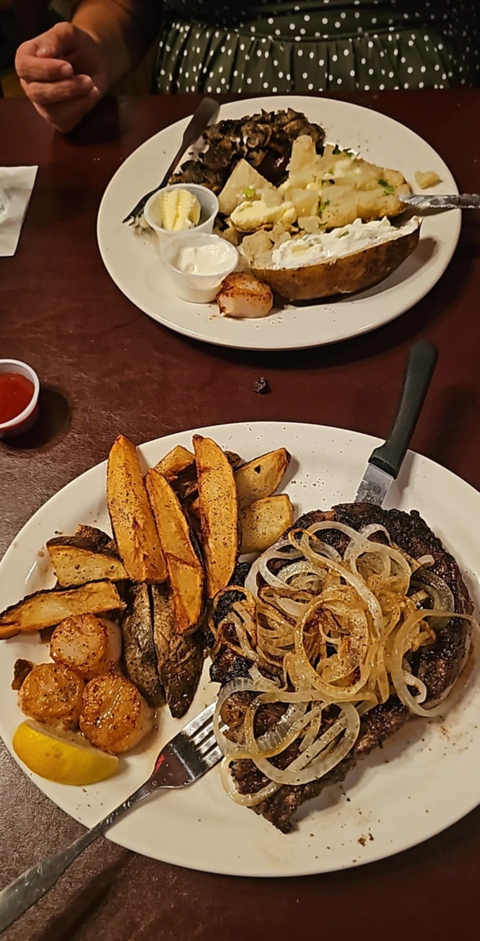 Read moreMade a reservation because I got tired of fighting the crowds at dinner time. 630pm comes and we're seated at a tiny booth for 2 thats almost sitting inside of the kitchen, directly in the servers path back and forth. I should have followed my first instinct and walked out. Food was mediocre....K&W at best. Browsing the menu I came across "4oz filet and lobster tail $54" "12oz prime rib $27"...it was my birthday so I went with what I felt was the safest option and got the prime rib. Meanwhile noticing how dark and dismal this tiny restaurant was, I couldn't help but have a PTSD attack by the sheer amount of noise this large group of northerners were making at the largest table in the restaurant. Banging on glasses,hollering and hawing, yelling screaming yeehaw laughing...which was all allowed with no problem by the manager and wait staff. Our food took forever to get to the table...the fries...or fried undercooked microwaved slabs of what was once a baked potato stole the show...disgusting undercooked potatoes. The baked potatoe I got with my meal was obviously microwaved, with dry paper skin and raw inedible inside fluff. My prime rib that was ordered rare arrived medium well...which may have well been a under seasoned roast. Spouse got the rib eye which was also overcooked, dethawed from being frozen and tasted of burned wood and artificial smoke. 2 waters. 2 entrees...90 bucks. The whole experience was awful...and have no idea how they managed to get a 4.7 star rating. They need to be shut down, it was just TERRIBLE. And do not say you rarely have an off night because there are plenty of people co.plaining about the exact same things Everyone that gives this place a 5 star rating has never ate at quality steakhouse. Your prices reflect this being a quality place to eat. It's just not there, you need a professional chef or two for these prices. Not a line cook or someone's mom that...