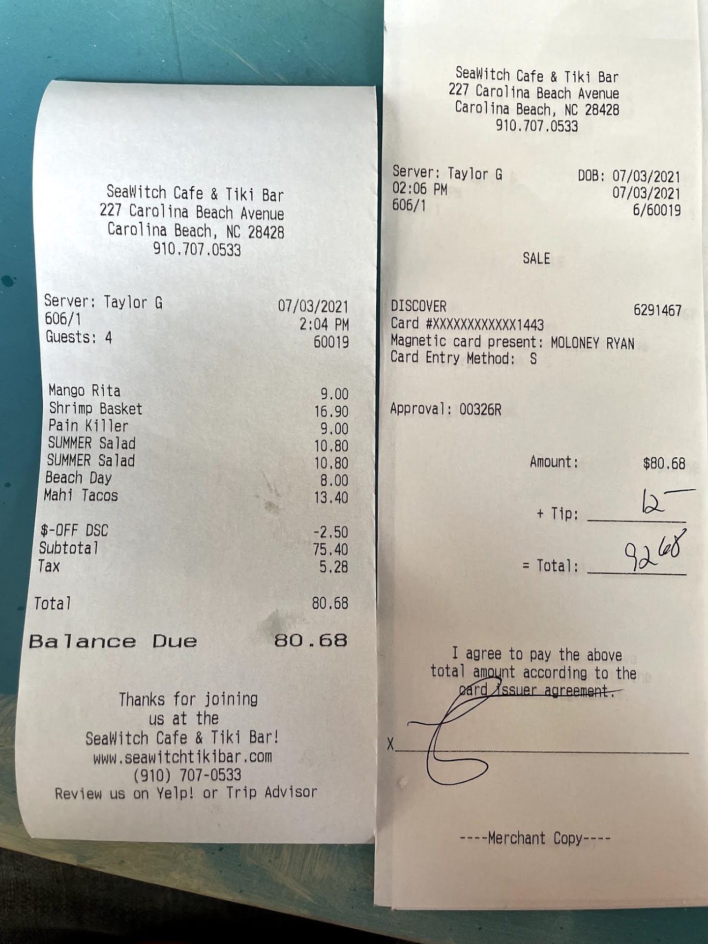 Read moreWell we just arrived in town a couple of hours ago. Couldn't check into out place yet so we walked down to Sea Witch. Thought we had found the place we would return to a couple of times because everything was great, especially the outdoor areas to dine. The trouble was that we ordered a strawberry salad for our kids to split and we clearly asked for no blue cheese, because...kids. It came out with blue cheese crumbles but we did not see them until they walked away. We tried to get the kids to eat it anyway and one of them would but the other was having a breakdown because we just got into town and he was starving. I brought the issue to our server, Taylor and she corrected it promptly. Then we get our bill and they billed us for both of our salads. I brought it to her attention and she says "Yeah, because your kids ate both of the salads." We would never have had to order the second salad if she had rung the first one in correctly. It's restaurant 101. You screwed up our order and we shouldn't have to pay for your mistake. I still tipped 15% but it definitely would have been more and they would have gotten at least 2 return visits out of us. If you want us to change our review Sea Witch, reach out and fix our check. We visited today and our check is attached. Ridiculous mistake to make.