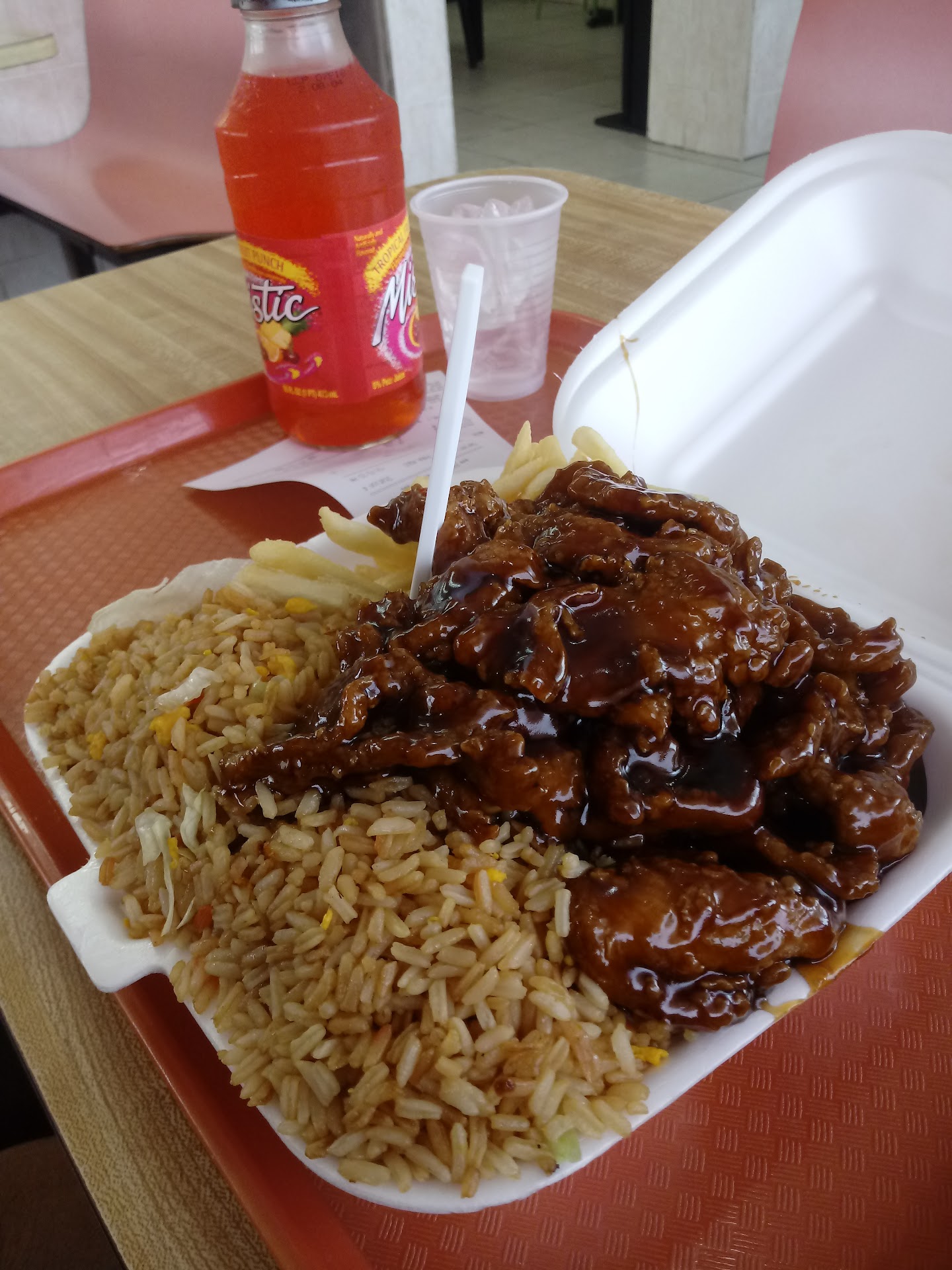 El arroz fue de lo poco que tuvo empatía con nosotros este día pues sabía bien y tenía bastante de todo en cuanto a cantos de carnes (jamón, costillas), revoltillo y cebollines. El pollo naranja era Gaby Mini Donas con sabor a canela y el pollo salado. No deberían ni ofrecerlo en el menú. El pepper steak es decente pero de ahí no pasa. Las costillas deshuesadas muy buenas, lo único bueno de las carnes en ese día. Los tostones fueron de bolsa y estaban hasta quemados y los egg rolls de Costco.