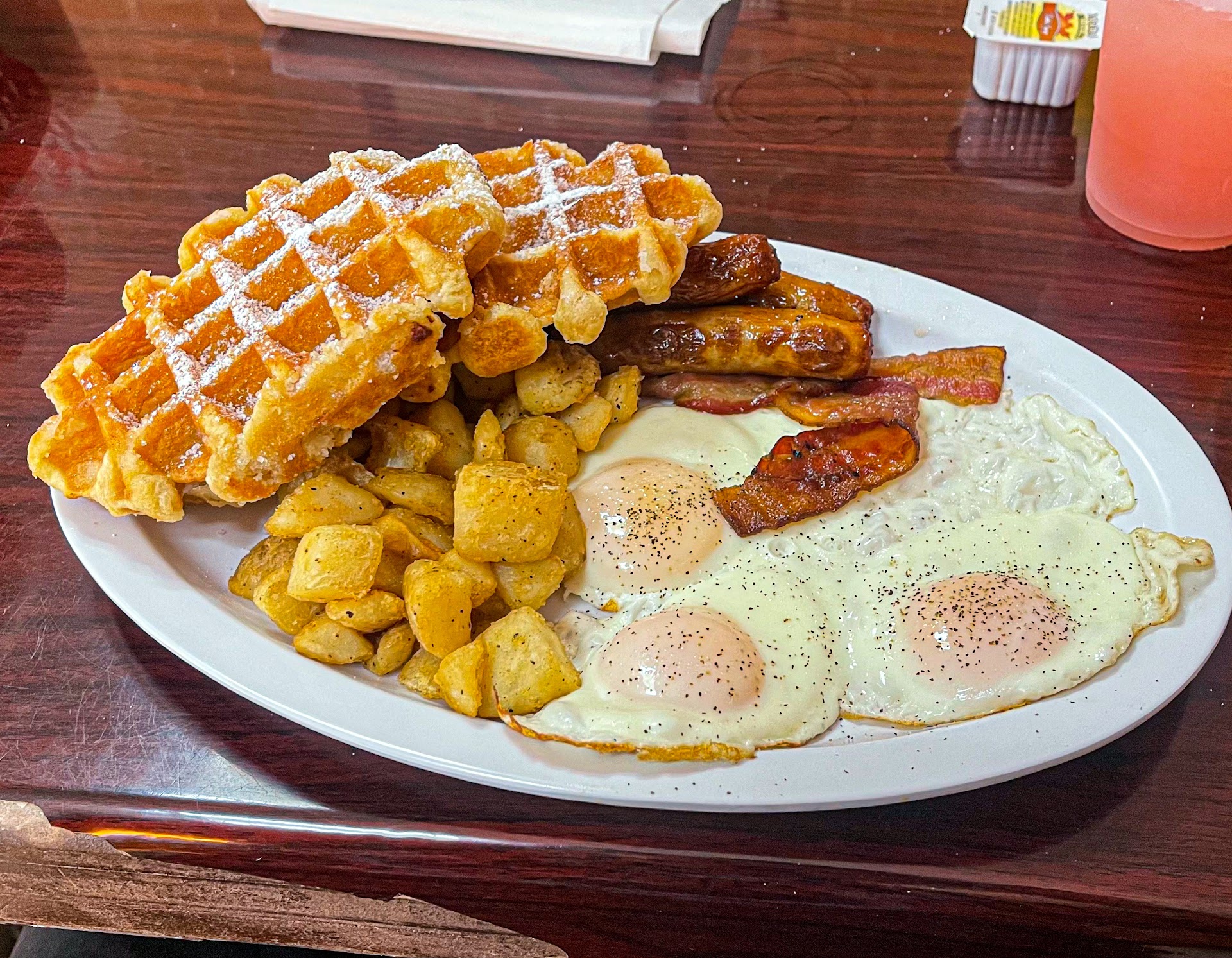 Review: One of many restaurants along the isla verde street that provides a variety of breakfast and lunch options. The eggs were cooked to whatever style you prefer however, they were bland and missing sazon. The home fries were soft with the right amount of crisp but also lacked seasoning. The bacon was crispy, salty, with the right amount of fattiness and smokiness. The highlight of the day was the waffles, they were buttery, soft, crunchy edges and sweet with the addition of powdered sugar. I would like to go back to try their omelettes and lunch items.