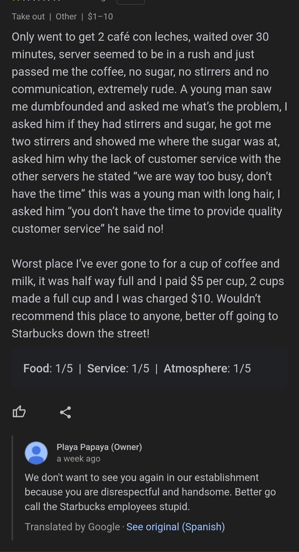 5 more minutes go by and the waitress never returned, if anything it seemed like she was picking up the slack for all the other waitresses. The coffee I was served was disgusting. It had to of been one part weak American coffee and one part cold milk; my coffee wasn't hot. I took one sip and put it to the side so I could ask for something else. I can't understand how I was served a cold, weak tasting cup of coffee in Puerto Rico???