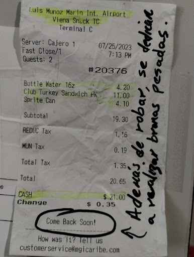 Read moreIf you're on a late night flight, this is the only place open on SJU Airport. Worst airport of all USA, but this is another story. Be careful with this place, 49 minutes in a lane to pay $21 for a small morge frozen club sandwich, a ¢.25 Costco bottle of water and a small Sprite can. The cashier with the same joy as a prisoner on his first day in jail, and slower than the pregnancy of an elephant (check it out). I saw a family of five spend $110 on 5 frozen croissants and three or four bottled minute maid juices. If they had ordered lobster on the plane it would be cheaper. And of course, don't expect a "thank you, you're welcome", although with the cost it is better that they do not tell...