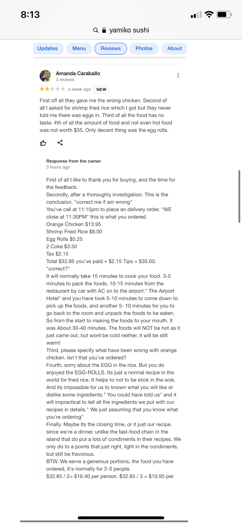 Replying to the owner: My fiancee and I are very well mannered and educated people that are spending vacation In Puerto Rico. We have eaten sushi all over the world and we went to your restaurant expecting to have a great meal. We sat down and we had some tuna sashimi as a starter (it was not fresh at all). We had already ordered 4 different sushis. After having some of it, we stopped eating, paid the bill and left your restaurant wondering why would you serve sushi if it is not fresh. By the way, we never parked any car anywhere, we never order “to go”, we have eaten your sushi. What upsets us is that you are Making up stories about who we are when none of what you say is true. Time to take a hard look at what you would expect from what you got and what you pay and ask yourself if you would feel...