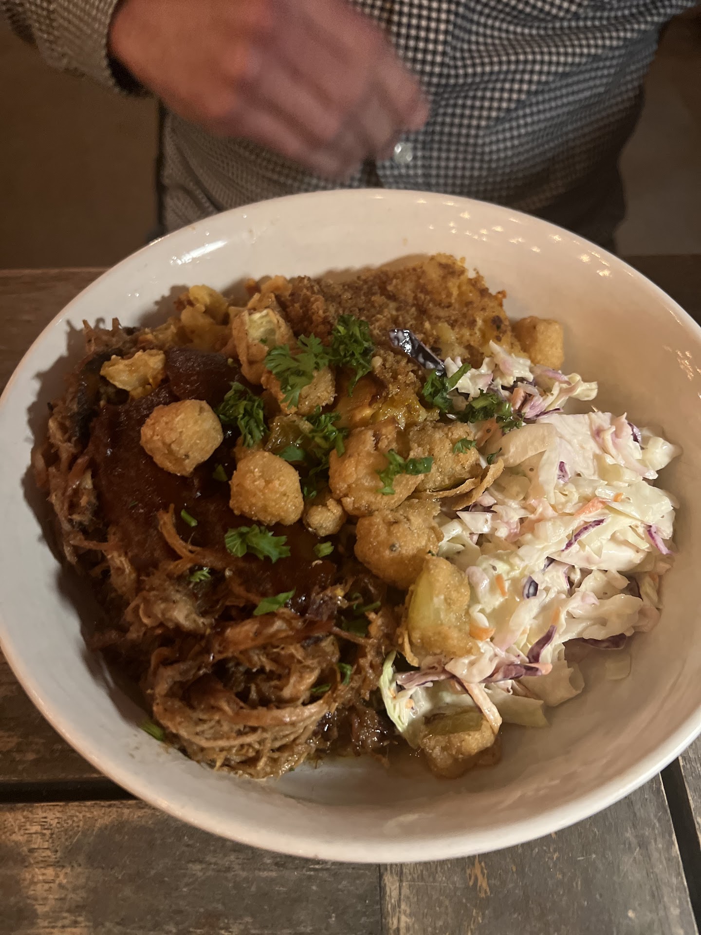 Well, we must have loved this, because while visiting Chapel Hill for 2 nights to show our daughter UNC Chapel Hill, we ended up eating at Acme Food & Beverage Co 2 nights in a row. I maybe should give it 4 stars instead of 5, because not every single thing served to us was perfect, BUT -- the things we had that were delicious were so very delicious that we returned for more. The first night, we shared the $20 tomato appetizer and it was just one of the most gorgeous fresh, ripe, full of flavor local heirloom field tomato experiences I have EVER had. I am not a shouty caps lock type computer user. You can check my other reviews and see this is true. But the chef at Acme has such a way with tomatoes that I guess it makes me a little shouty. If you are there in tomato season, please try however it is they are serving tomatoes. Wow, just wow. For that very expensive price, we got a platter large enough for the hungry three of us to share as an incredible appetizer. It was all beautifully ripe and intensely flavored field tomatoes treated in a variety of ways, each way was exquisite. Their tomato pie: also exquisite. Tomato, cheese, mayo, basil etc baked into a great crust. Southern mouth watering deliciousness. We loved that tomato appetizer so much that we got a tomato pie to split as desert like total unrepentant weirdos. For dinner, one of us got the pork bbq dish - meh, salty and only okay. I'd skip that for sure...except that it did introduce us to their fabulous mac and cheese. Pretty sure there is some smoked gouda into the cheese mix, and a wonderful crunchy topping. Another of us had the smash burger, which was almost too salty but it pulled it off as a gourmet/sleazy diner happy mashup burger. It is a grill fried patty mash fried, topped with simple cheese, served on a perfect potato bread burger bun. Great duck fat type French fries on the side. This was a winner, which was ordered by another of us on the second night. I had the brined and seared pork chop, and it was moist, crispy, very tasty. I could pass on the bed of corn and diced tomatoes it is served on, which was fine, but just not up to the magnificence of the other great items there like the tomato app, the mac and cheese, the burger, and the tomato pie. Returning the second night, it was that fantastic tomato app for us again, a repeat on the smash burger but, I switched to the salmon and it was excellent, and one of us just got the mac and cheese and tomato pie for their entree. What this place does well, it does stunningly well. But some menu edits are in order for it to be the kind of spot that wins awards, that draws a crazy word of mouth obsessive following even from foodies out of town. But it could get there. Someone in the kitchen has loads of talent and a gift doe certain ingredients. Also, Acme has a wonderful location set into a historical shopfront in a very charming hip gentrified revived southern university town. That whole Main St area was packed with adorable bars, shops, places to dine and hang. The beer list was nicely chosen, and Acme has a lovely back garden full of string lights, reclaimed wood build ins, a water feature, etc. The name made it sound like some tacky strip mall eatery, but Acme is instead full of charm and character. I wish I could take a tomato themed cooking class with the chef -- their tomato magic...