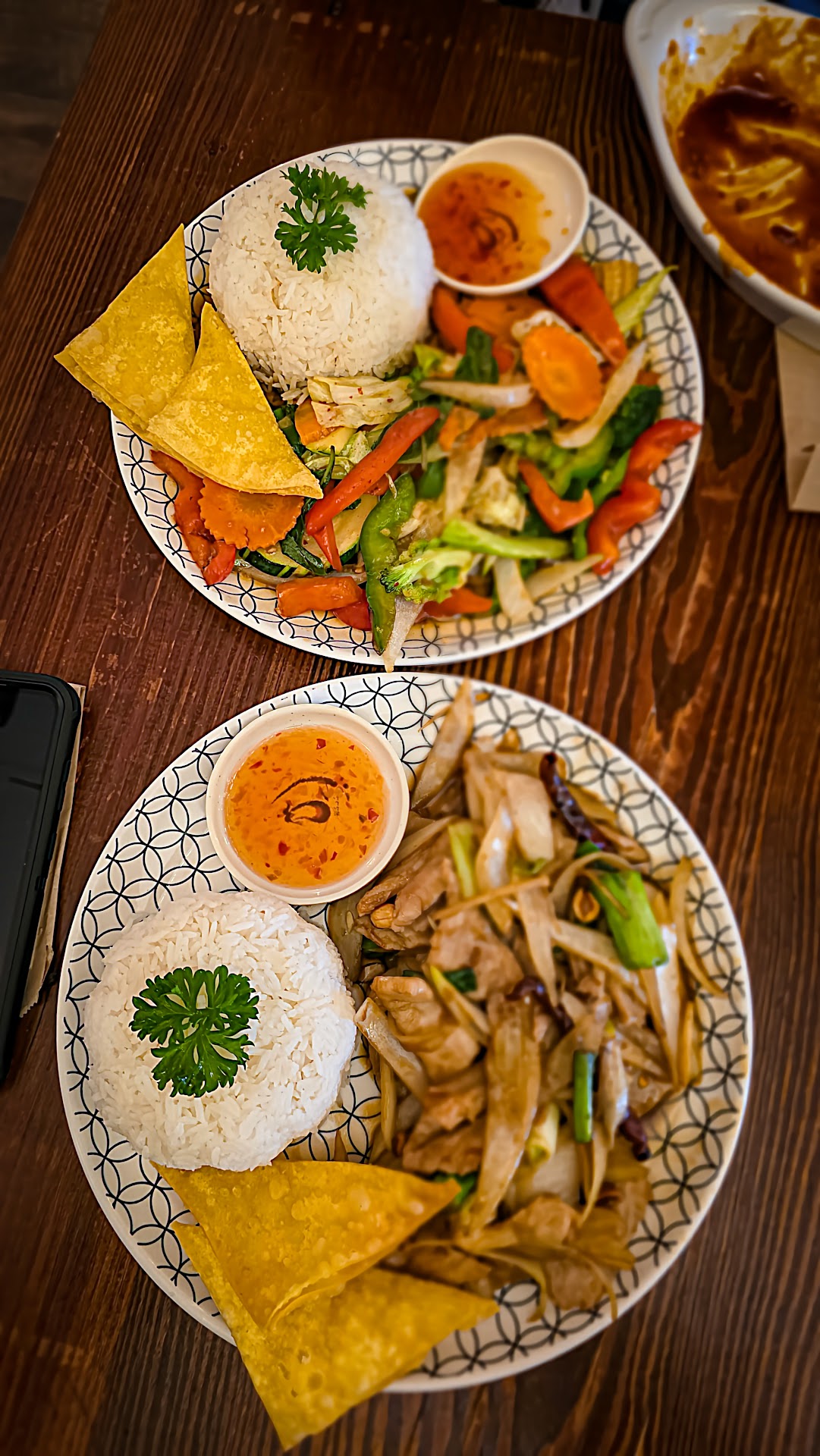 Food is absolutely wonderful but the service is subpar-if they work out the kinks, they will really have something here. We arrived around 6 and were seated immediately, we were brought water and menus and pretty much ignored for 20 minutes until I finally made eye contact with our server-who was as sweet as can be-just didn’t stop to get our order despite walking by the table multiple times until I literally waved and made eye contact. We ordered an appetizer and three entrees. My entree came within five minutes. The server said “the rest is on its way”. My dish was delicious but it was so awkward eating in front of my hungry family. I shared but still-not much joy in them watching me eat. When I was about half done with my meal the egg rolls came. $2 each. They were good. They weren’t egg rolls to me-they were giant spring rolls. They were good but not what I expected. Bland inside. After my meal was completely gone, they brought out my daughters dish. About ten minutes later they brought out my husbands and at that time, I ordered a dessert. The dessert came about the time my husband was finishing his meal. So-we all sat at the same table but didn’t really get to eat together. Pad se ew-so so good. Pad Thai good. My husband got a vegetarian dish-mushrooms and garlic-was very ginger forward but good. Serving of rice that came with his was way too small. Mango and sticky rice dessert was delicious but very steep for the size of it.