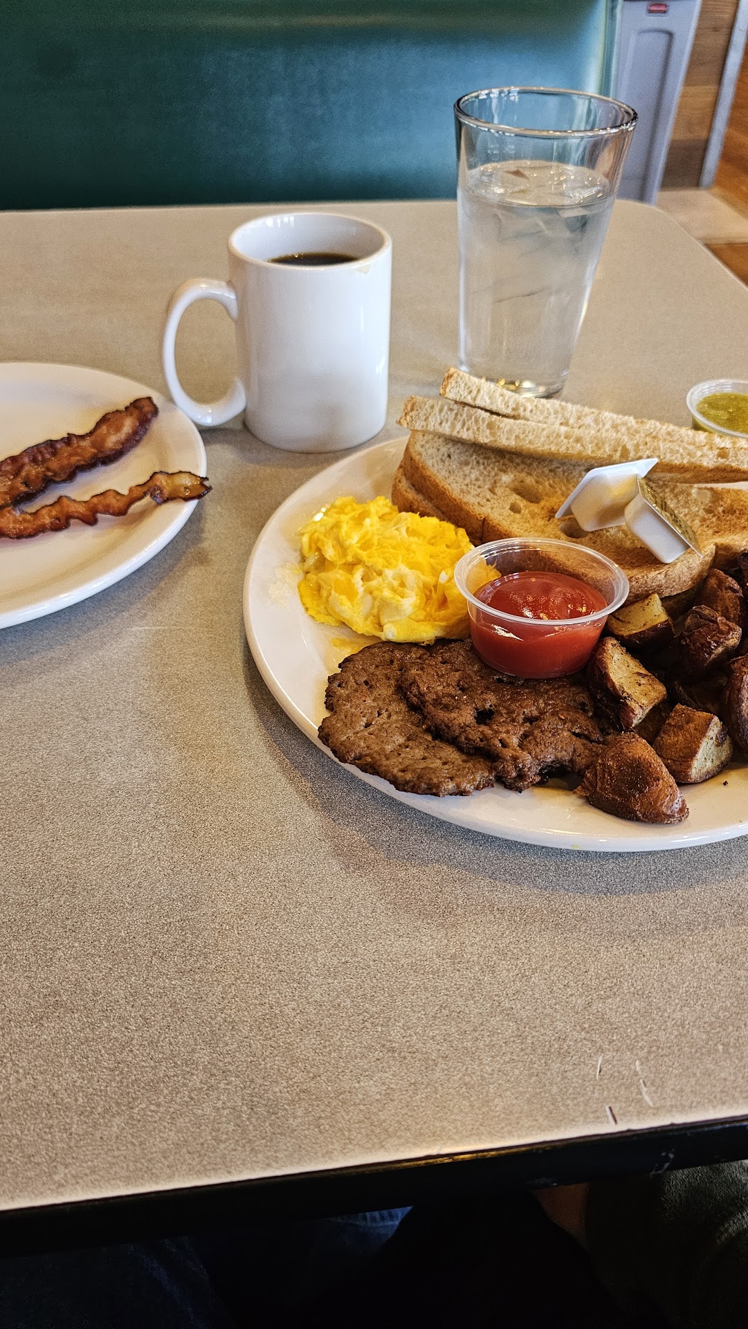 I ordered the Grata plate, which was 2 eggs, breakfast meat (I ordered both sausage and bacon, goodbye arteries), home fries and toast.