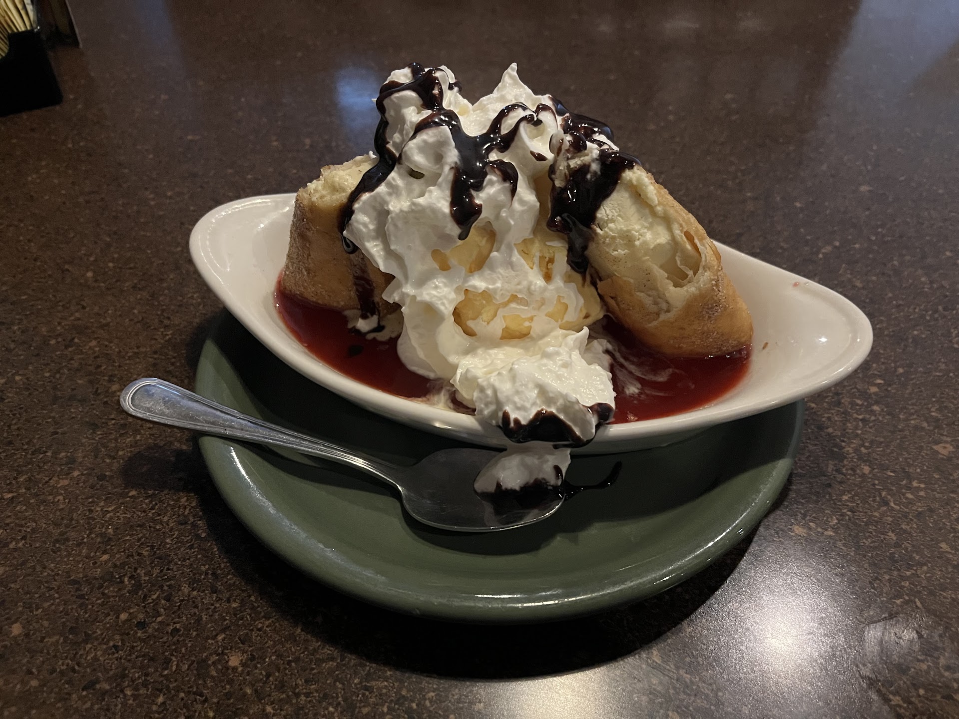 Yet, I do not throw in the towel completely, for any solo dining experience demands either a drink or a dessert, and since I don't drink, dessert is in order. I get the Chimi Cheesecake (pictured), and regret only that I ate too much of the burrito to fully appreciate the fried cheesecake, ice cream, and cherry sauce in the way it deserved. It was indulgent, rich, and perfect when you need to cheat on your diet.