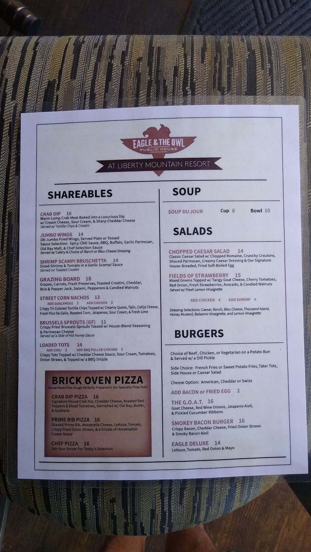 Read moreAfter an all day motorcycle ride, enjoying some sights throughout southern park of PA and northern MD. We made our last pit stop of the day at Eagle and the Owl Pub inside of the Liberty Mountain Resort. It is my understanding that this part of the resort was just recently constructed (within the last yr or 2). The inside of the resort looked beautiful. The Pub was very VERY nice. The tables were all spaced apart perfectly so other patrons convos didnt interrupt yours. There were 4 of us. We each got different entrees all of which were AMAZING. Foods I'd recommend trying would be the crab cake sandwich. It was jammed packed w/ crab meat with very little to no filler which you rarely find in restaurants, the Rachel sandwich was so tasty. Such a unique variety of toppings added just the right tangy flavoring. The corn on the cob comes topped with butter, cheese and other herbs and spices was so good & for dessert the mango something creme brulee let me just tell you it changed my life. I got it just because I was curious and let me say it was the best thing my tastebuds have tasted in a long time. Now keep in mind while eating all of these delicious foods you get to look out the full wall of Windows onto the endless beautiful golf course...