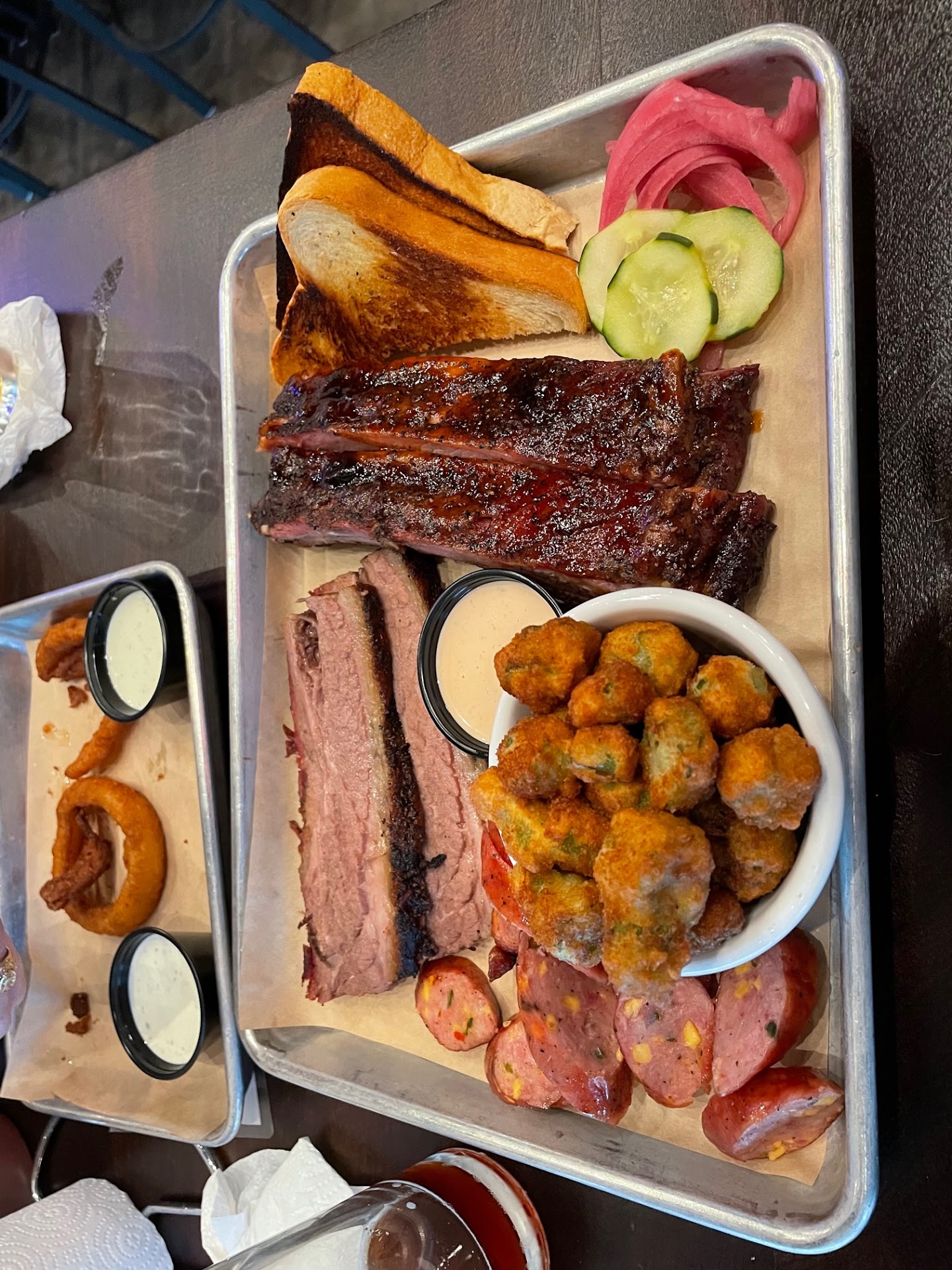 The brisket was great—soft, juicy, and flavorful. But the pork belly burnt ends were tough and not juicy at all, though they were seasoned well. The ribs were by far the worst. They tasted like they’d been made the day before and just reheated—dry and disappointing.