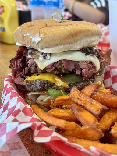 Great burgers to go! First the bad... The place feels dirty. Mostly because it is. Some paint and a little refreshing of the place wouldn't hurt. They don't deliver. There has been a sign on the door for years now saying that they have stopped delivering until further notice. IE: never apparently. This is unfortunate, I would order from them constantly if they would. And I'm sure I'm not alone. Now for the good: Burgers are nothing short of awesome. You can find most any combination to suite your tastes. The burgers are large and very satisfying. If you are watching your carb intake, they will happily serve you a bunless burger on a bed of lettuce, onions, pickles and tomato. I top mine with a smear of mayo and mustard for a sauce. Their cooking method is smash burger. My only complaint is that some of the cooks don't understand that you can't smash the burger again after 30 seconds of cooking. Doing so presses the tasty juices from the patty making a drier burger. The hamburger seasoning is top notch. It's applied to the outside of the patty only. It's absolutely perfect. As long as you don't get a smash happy cook, these burgers are second to none. The offerings include more than burgers, but the burgers are certainly the super star here. The sides are great as well. They offer fries in regular and sweet potato. Both are outstanding. The chili cheese fries are addictive. The chili doesn't over power the frys and allows you to taste both with the cheese. Simply perfect. The quality seems to be about equal across different locations. The price is the same as your local fast food hamburger joints but a much better burger...