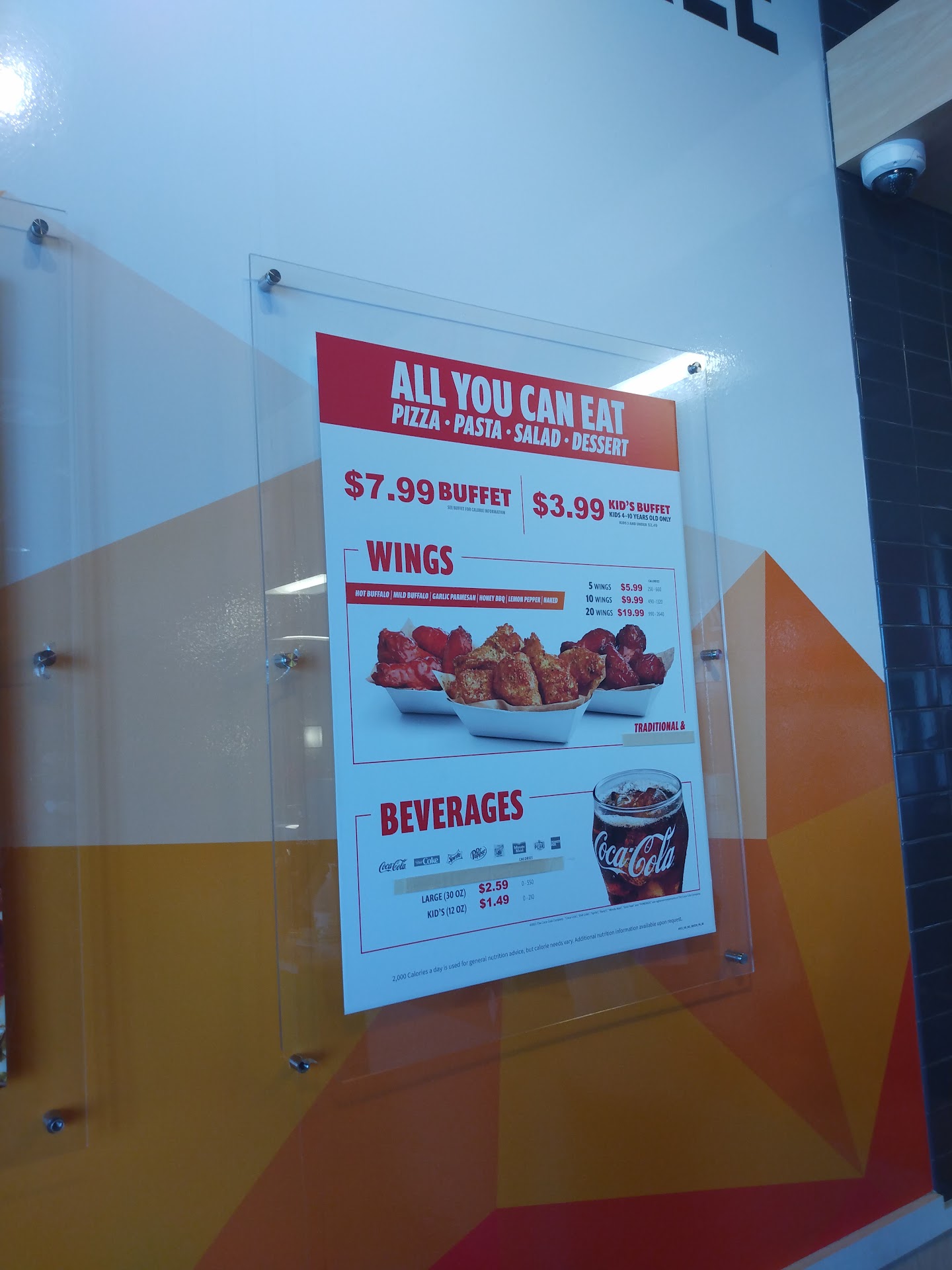 The salad bar, if it could be called that, offered sad, wilted, lettuce with over half of the bins for the accompaniments empty of their contents. There were three jugs designated for ranch dressing, two of which were empty, the third with only drops remaining. The pasta bar had an abundance of noodles, albeit hard from continued exposure, and no pasta sauce to speak of. Luckily, we did not necessarily come for the sad lettuces or the uninspiring pasta. We came tonight because our daughter wanted to enjoy their pizza. It is almost unbelievable that our experience could be any more dismal, yet, here I continue.