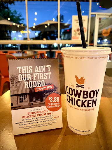Holy Cow, Or should I say Holy Chicken. The food at Cowboy Chicken is amazing. And do you know how I know it's really good? Well I ordered food for delivery online and it was still top notch. Ordered the #1 family pack which was a whole chicken, 3 sides (got twice baked potaters, corn fritters, and mac & cheese) with 4 rolls. Also wanted to try the Enchiladas so ordered the plate with two. Added two of the smaller choices of Peach and Apple cobblers to try them both out and boy was that a huge mistake, I should have ordered the Texas sized cuz they are so amazing that I woofed them down in like 3-4 bites each all by myself. Hey don't judge until you try the cobblers too. I typically don't like pies nor cakes so cobblers are a great choice and especially from Cowboy Chicken. Anywho, The guy that was delivering the food called me while en route and pre-apologized for being late even though he wasn't yet. The food traveled about 5 miles from the Carrollton store to my location and arrived still warm and only about 2 minutes later than the 15 min delivery window that the online and confirmation email stated. No big deal and I wouldn't even call that late and since the guy had already called and was so nice and friendly while delivering it, it makes you look over a simple tardiness like that. It is so refreshing to have a home cooked style restaurant like this around that certainly one ups chicken places like Boston Market. The logo is cool too and I'm glad this all started in Dallas TX. Wooo Hoooo Yall!!! Try some Cowboy Chicken you won't be let down nor disappointed. The seasonal Honey Orange Ice Tea is so good I will most likely visit again tomorrow or the next day just to get a gallon (or two, or three, or four; yeah it's that good) and to take some of my fellow employees to try this hidden gem out. Also, with Thanksgiving in a few days I might get a pan of cobbler and a rotisserie Turkey (a special right now per Instagram) for my upcoming family feast!! Too bad I joined the loyalty club after I tested the food for the first time, cuz I missed out on some points today. Sorry no pics of the food, because I was too busy eating this great tasting stuff and there is nothing left to take a pic of anyway. Thank you Cowboy Chicken for a great meal, you've just found a loyal...
