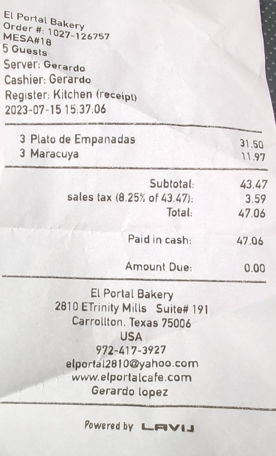 Read moreAs a Colombian, of course you'd expect me to say nothing but great things!! But, I'm an honest Individual and I'm just not that type of person so here we go, El Portal one of the most popular Colombian restaurants in the DFW area and price wise one of the best options.Flavor, when they first opened up the flavor was there; seasoned to perfection with all the authentic flavors of the dish, as the popularity has grown the quality (when it comes to seasoning) has diminished, definitely not a fan of this. Other wise I must say the food here is great, ambient makes you feel welcomed and at home as if they have known you for years what can I say Colombians are very lively and colorful people, restaurant is quite clean quick in getting your orders out and plenty of pastries to take home after a great meal.. Love this place and would recommend it 10/10 times. If you are vegan or vegetarian, I wouldn't recommend going here. we Colombians don't know such abominations.🤣 jk.. I don't think they have options, but I could be wrong. i would suggest calling and finding out before...
