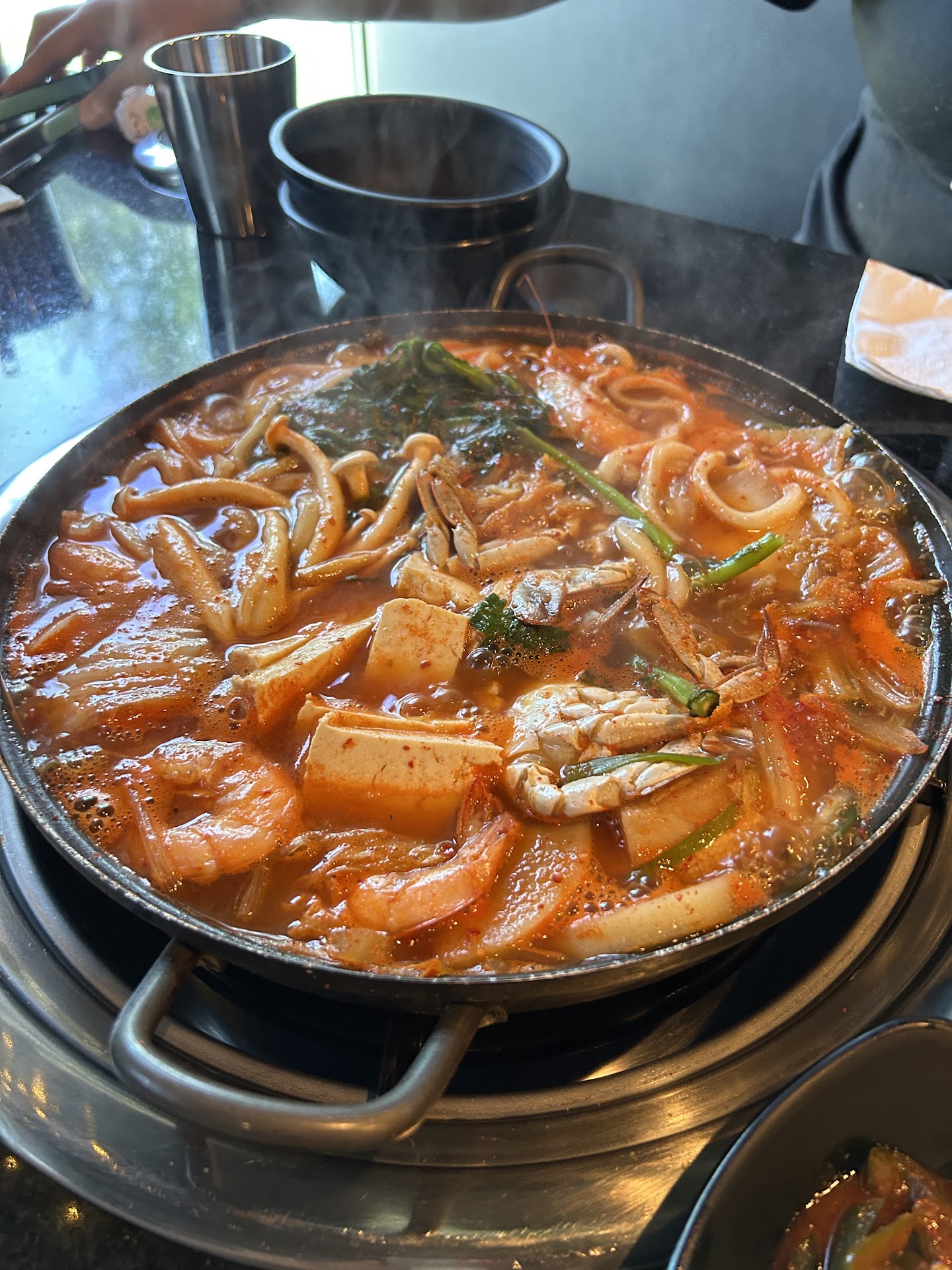 We ordered the seafood and noodle hotpot with the short ribs & a seafood pancake - all of which came out quickly and tasted delicious. Everything was so fresh! She refilled our side dishes of kimchi, pickled cucumber, spicy jalapeños, eggplant, and fish cake as needed without being asked and even brought out a side dish of mung bean cake that they usually serve for dinner for us to try. Even the steamed rice was delicious! We ate to our heart’s content and my baby slept through the whole lunch to the k-pop tunes playing in the background. She offered us to go boxes and even a drink to go, but we declined bc we weren’t going straight home. Overall, a delightful experience for a first time and I’m already looking forward to visiting again with my husband since he dislikes crowds. (It’s helpful with the baby too… but I could swear I’ve seen this parking lot packed out at night!) I’m sure he’ll appreciate Esther & her charm. I even heard her offer a side of kimchi to a delivery driver picking up a to-go order - so kind!