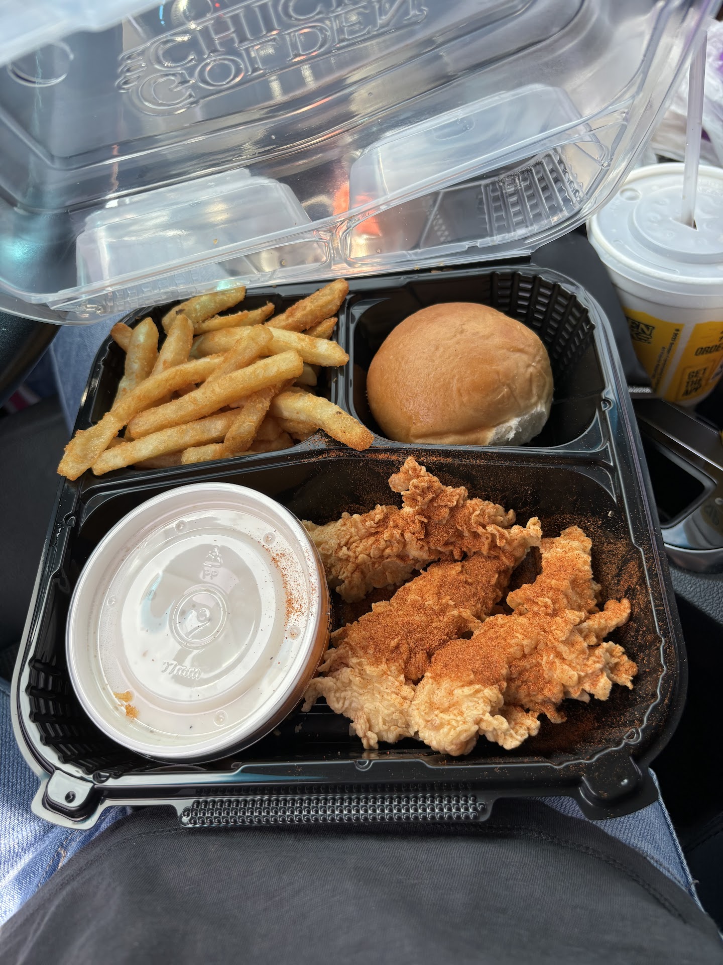 Read moreThis was an inside order for to go. I had ordered the $20.99 limited-time offer family meal that came with 12 chicken tenders, one family side, and three yeast rolls and a free ice cream cone. The chicken tenders can either be normal or spicy– in my case I got half spicy and half normal. The staff didn't greet me, I had to walk up to the cash register before I was actually noticed and not with a "hello" either, however they were friendly and smiled. It took about 7 minutes to receive my food. The food was still hot when I got home (about a 10 minute drive). Instead of 3 rolls, I received 4! The rolls were soft, hot and buttery! I received the total 12 tenders, but about half were very small , no bigger than my pinky finger and some tenders had large patches without breading (the image included with hand comparison are full tenders). The mashed potatoes were very crumbly but tasted well. The spicy chicken tenders were very spicy! Normally I handle spicy foods well but boy howdy I needed water nearby! The spices seem to be the same they use on the Tallahassee hot chicken sandwich. I love chicken tenders but I would rate these about average and the mashed potato side as nothing to write home about. I had requested the honey mustard dipping sauce but never...