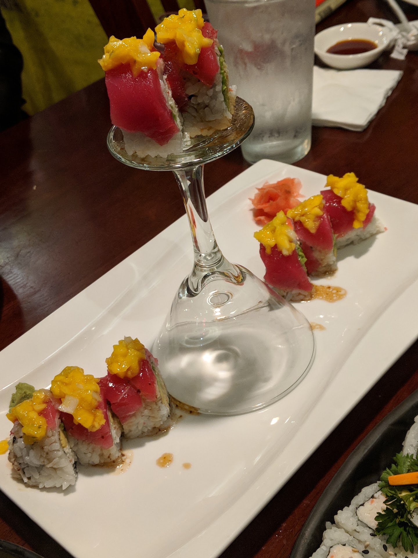 And more than just good taste, we got a very pleasant surprise. The sushi we did get was beautiful, in form and presentation. It's taken for granted in Japan but so rarely seen in America. There were ornamental flourishes such as a cucumber crown on our sushi tower to a carrot triskelle on my California roll. (A California roll? Who hand garnishes a California roll?? This place, that's who.)
