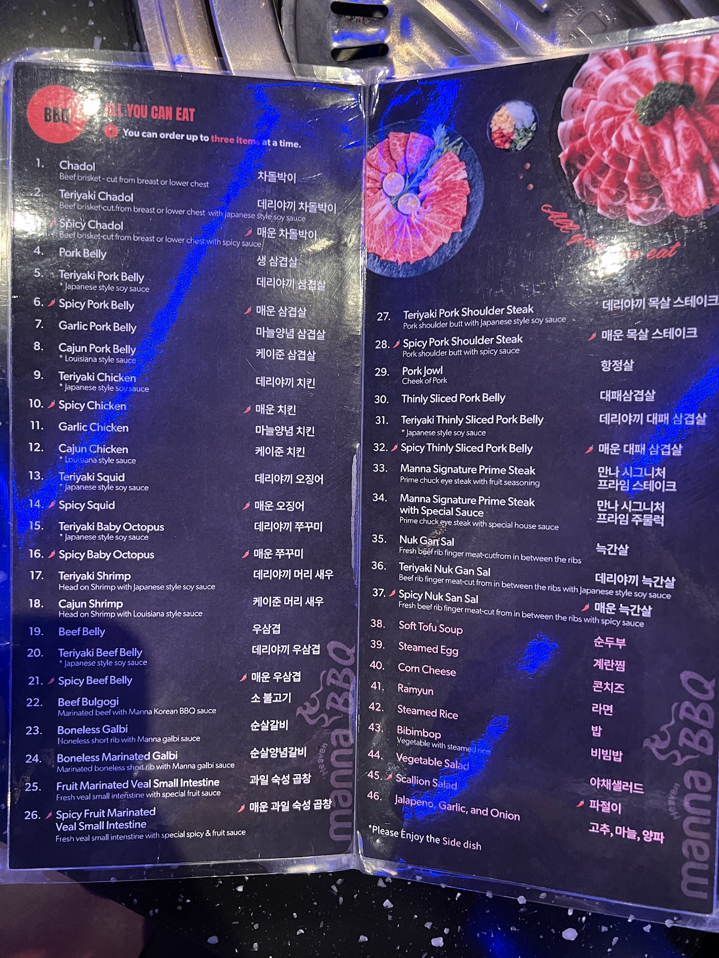 To start with the basics, it is an AYCE/all-you-can-eat Korean BBQ restaurant where the servers would bring out raw meats for you to cook on the grill yourself. Additionally, they would bring out complementary Korean banchan/side dishes like kimchi, seaweed, radish, japchae, salad, etc. to go with the meat you'd prepare. There are two options, with the pricier plan just $5 more. I normally stick to Dinner A though because it has everything I really need. There are beef, pork, chicken, and seafood options available to you, so everyone can be satisfied.