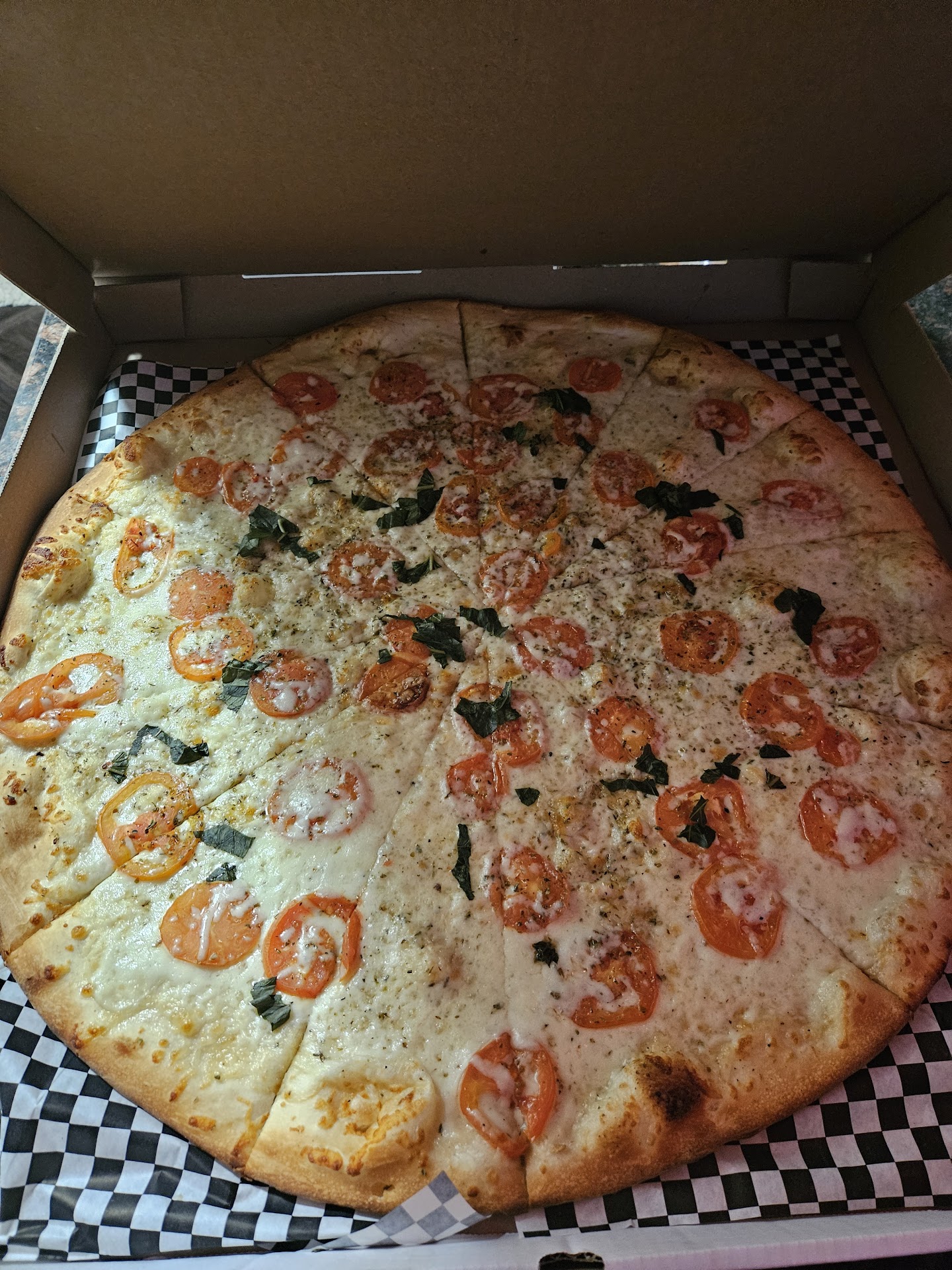 Read moreGreat large pizzas! Someone mentioned lack of consistency and I kind of agree. Ordered from here twice. Both times the margarita pizza has tasted different. First time, I could taste more garlic. 2nd time it was still good; I just had to add my own garlic powder. But overall definitely great quality. Service is quick and on time for pick up. Came back for margarita pizza again. Top notch! The bread is perfect. Thin pizza. Kinda oily but it's EVOO. Love the crust also. There are 2 entrances into the restaurant, one of the back and one from the front. Front is easier. But if you use the back door, there is an immediate drop off on the ground to the street so be careful carrying your pizza out the back door, I almost fell. Prices are high for these pizzas but again you're getting quality so it's worth it.