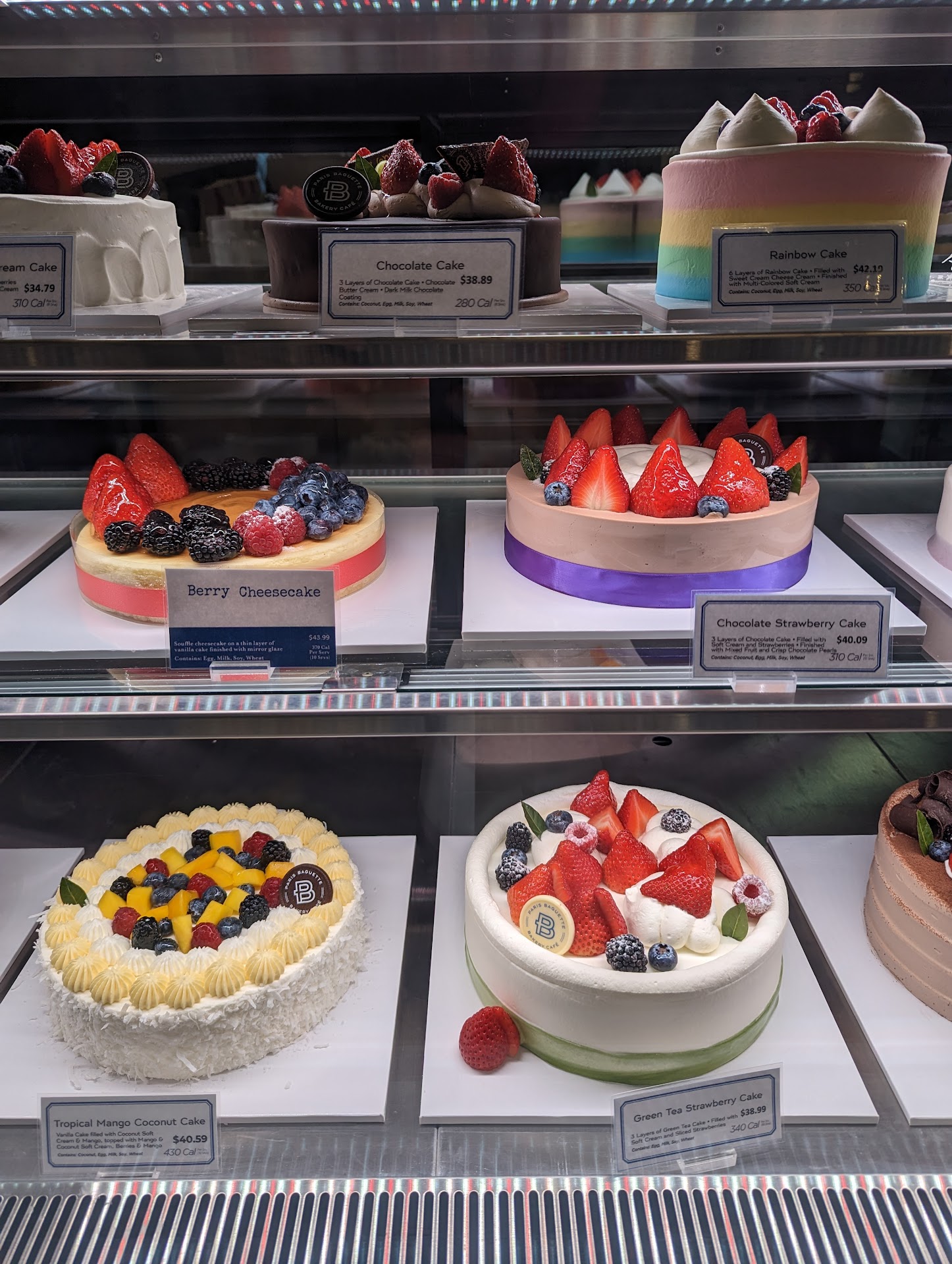 Read moreOverall very nice, clean, modern bakery. If you compare Korean bakeries to other Asian bakeries like 85 Degrees, you'll notice their prices are always more expensive, and this bakery by Paris Baguette is no exception. Pricing ranges from $3-6 for any bread, big or small. I did get a coconut cream croissant which was delicious but definitely overpriced. I find it hard to push myself to buy or try more of their breads and pastries when their prices are so high. I mainly came to this bakery to try some cake slices to decide if I'm going to order a full cake from them. I ended up getting the Strawberry Soft Cream Cake, Chocolate Strawberry Cake, and the Blueberry Chiffon Cake. Overall, my favorite one was the strawberry soft cream cake. However, the blueberry Chiffon Cake came in close second. I will say, there is a LOT of competition in the cake/bakery scene in this location. There are at least 3 Asian bakeries nearby. If we're comparing strictly on size and price between the Korean bakeries that are all in the same plaza area, Tous Les Jours is more expensive with smaller cake sizes while Ecclesia is slightly cheaper with the same size cakes. I will say Paris Baguette is very comparable to Ecclesia in my opinion in regards to the cake department, so if you want to save a couple of dollars, you can pick Ecclesia instead. However, I do believe in trying different bakeries or else you'll never know if there's something better out there, so I wouldn't say completely rule Paris Baguette out as an opinion. The cakes from Paris Baguette are nice, light, fluffy, and not overly sweet which I like. I also really like that they use whipped cream instead of buttercream, which I absolutely hate. Their cakes were delicious and something nice to try for a new bakery that I haven't tried before. I might consider ordering a cake from them in the near future...