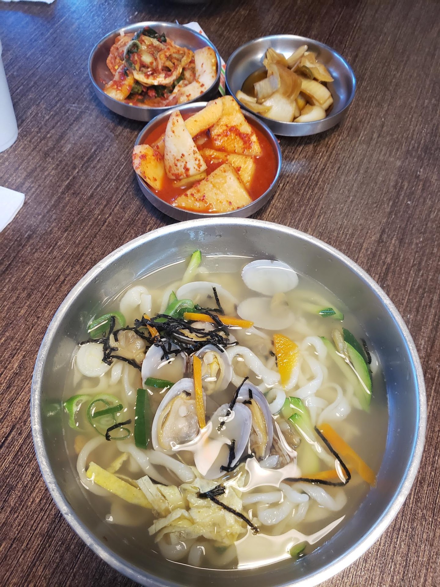 I usually get the kalgooksoo (handmade noodles), but I got the Seoul leung tang soup for the first time today. An employee said that the owners (an older couple) boil their beef broth for 24 hours. Their kimchi is still good. They had yeoll mu kimchi too during my recent visit. My family and I love this restaurant! It's across the street from H-mart, so it's not as well known, but the food is delicious. We especially like the hand-made noodles and dumplings that are made fresh. Our favorites are the clam and anchovy noodle soup.