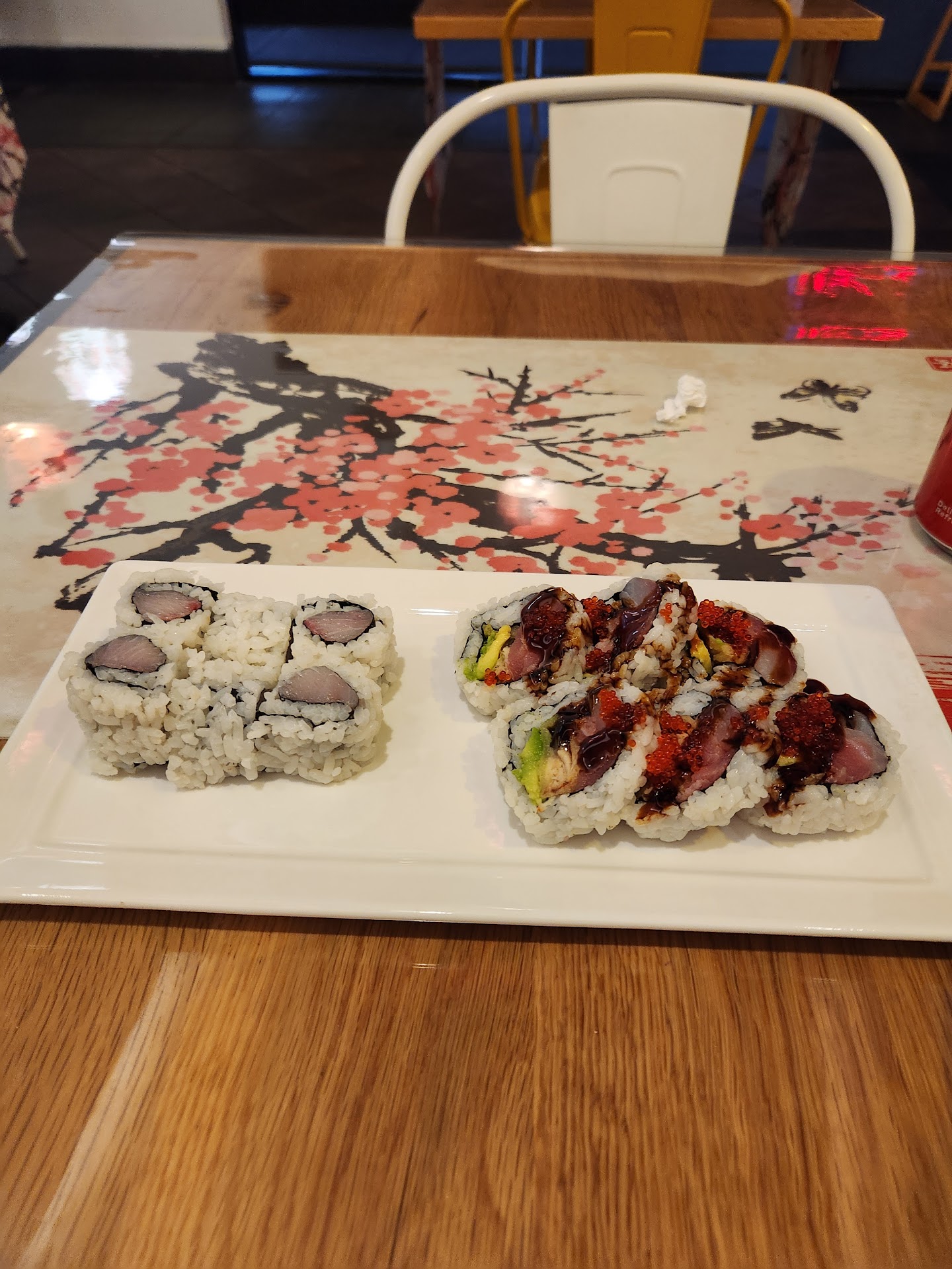 Read moreWas craving sushi for lunch and this was the closest to work with decent reviews. Quaint, small dine in or to-go. I sat down and in just a few minutes had my drink and 8 min later my sushi. I ordered a custom spicy tuna w/ creme cheese so it was a $1 upcharge, otherwise 1 single roll, which is 8 pieces and more than enough would have been under $7. Can't beat that for fresh sushi. It has a good taste. Nothing fancy. Very well sushi. Good service because midway through they checked to see if everything was ok. I would come back here. The restaurant was quiet when I came but still friendly and fast service. Unlike previous review I was not served on a paper paper. Great small...