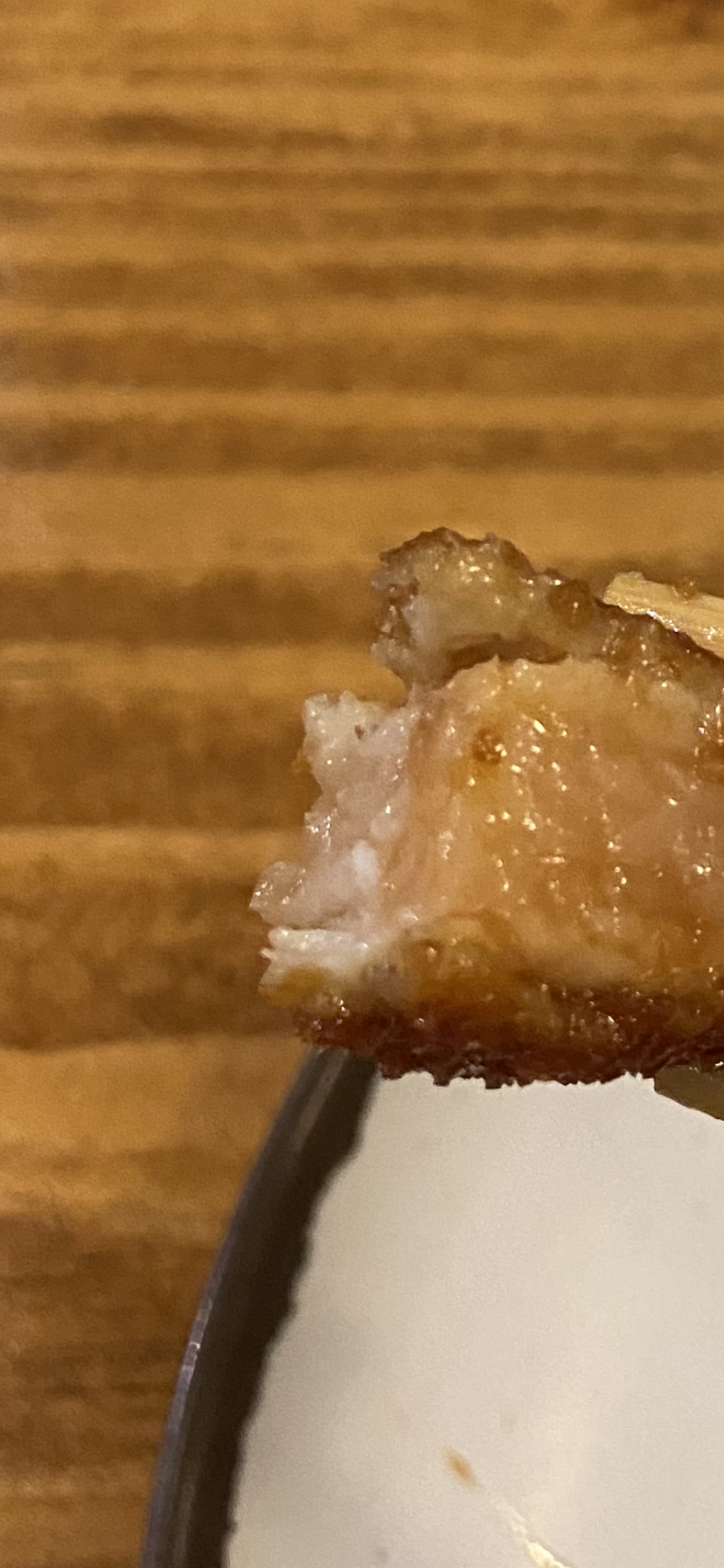 We went on Saturday afternoon around 3:30PM with a reservation. The place was about half filled, not too busy but not too slow either. We started with appetizers, one of them being chicken katsu. The katsu came out within 10 minutes of ordering, but it was extremely oily to the point that it looked partially wet. I overlooked it and started eating. Thought something tasted off right away but didn’t really think too much about it or examine the meat. I should have. By the third piece, this AWFUL texture hits me, I finally look closely at the meat, and see that it’s RAW. As you can see in the picture, the meat wasn’t just a little raw, it was mostly uncooked.