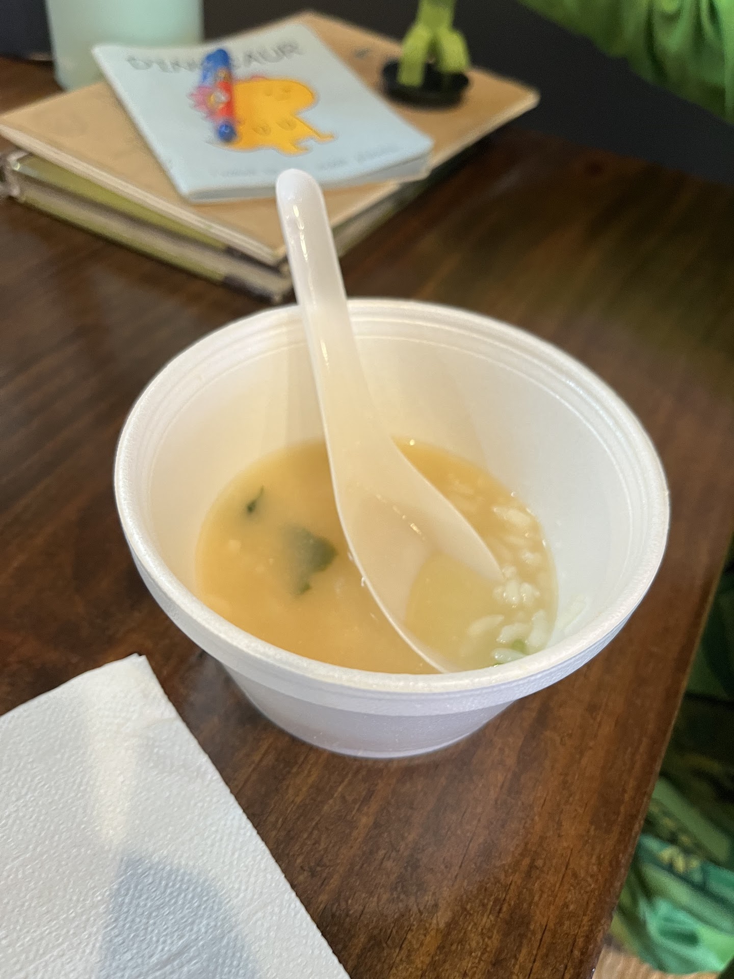 Bland American food cooked in soy sauce and served in plastic bowls and trays.