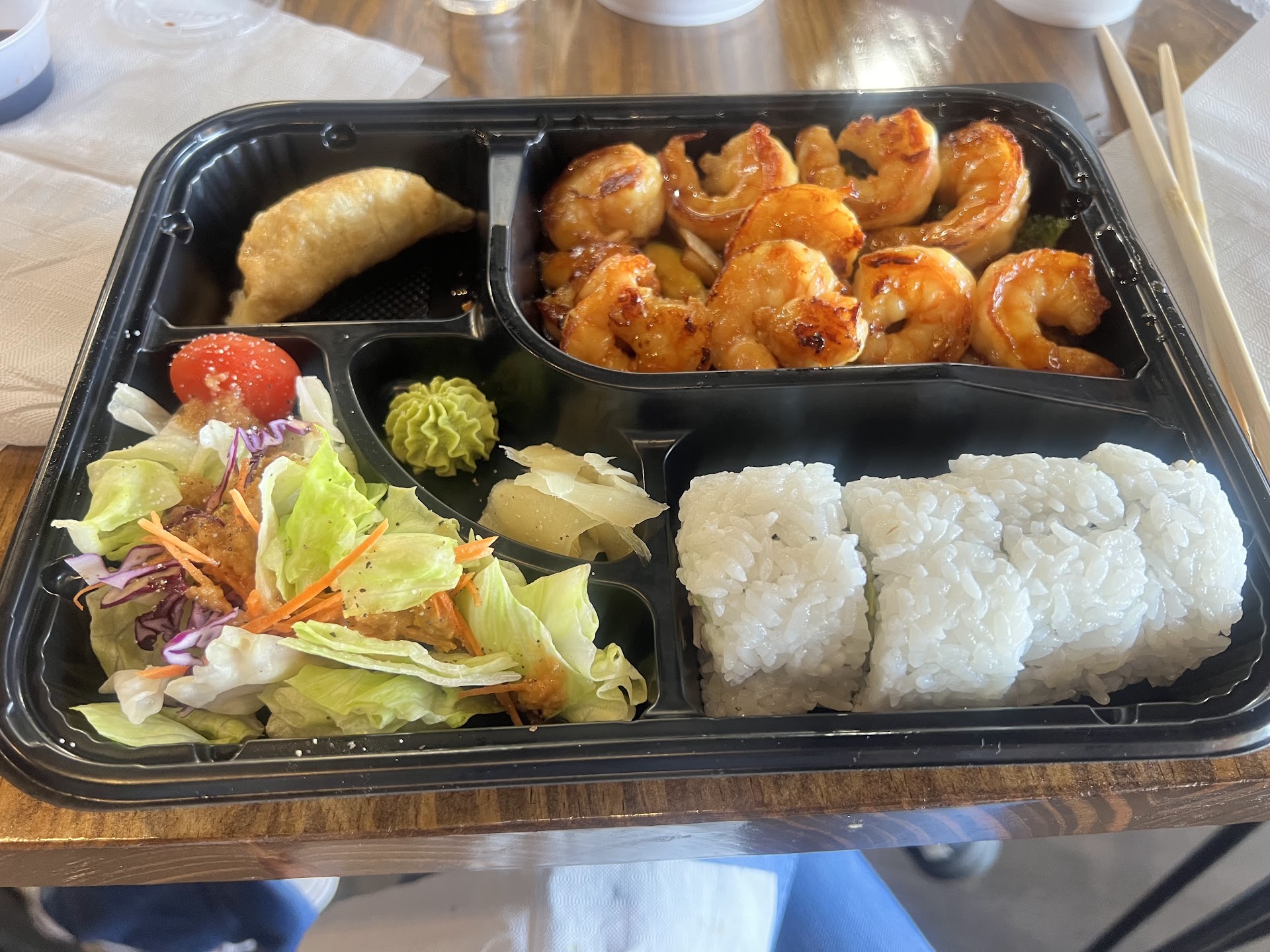 I ordered the teriyaki shrimp bento box and the server asked for my preferences in all options to ensure that my order was correct. It comes with 2 dumplings, salad with ginger dressing, the teriyaki shrimp was on top of grilled veggies (, , ), 4 piece roll of Cali or spicy crab and rice (steamed or fried). The rice was a nice portion and was served in a bowl on the side. The Cali roll was big and made with all fresh ingredients. My daughter ordered the shrimp tempura roll; it comes with 8 pieces and is a very large roll with fresh and real ingredients.