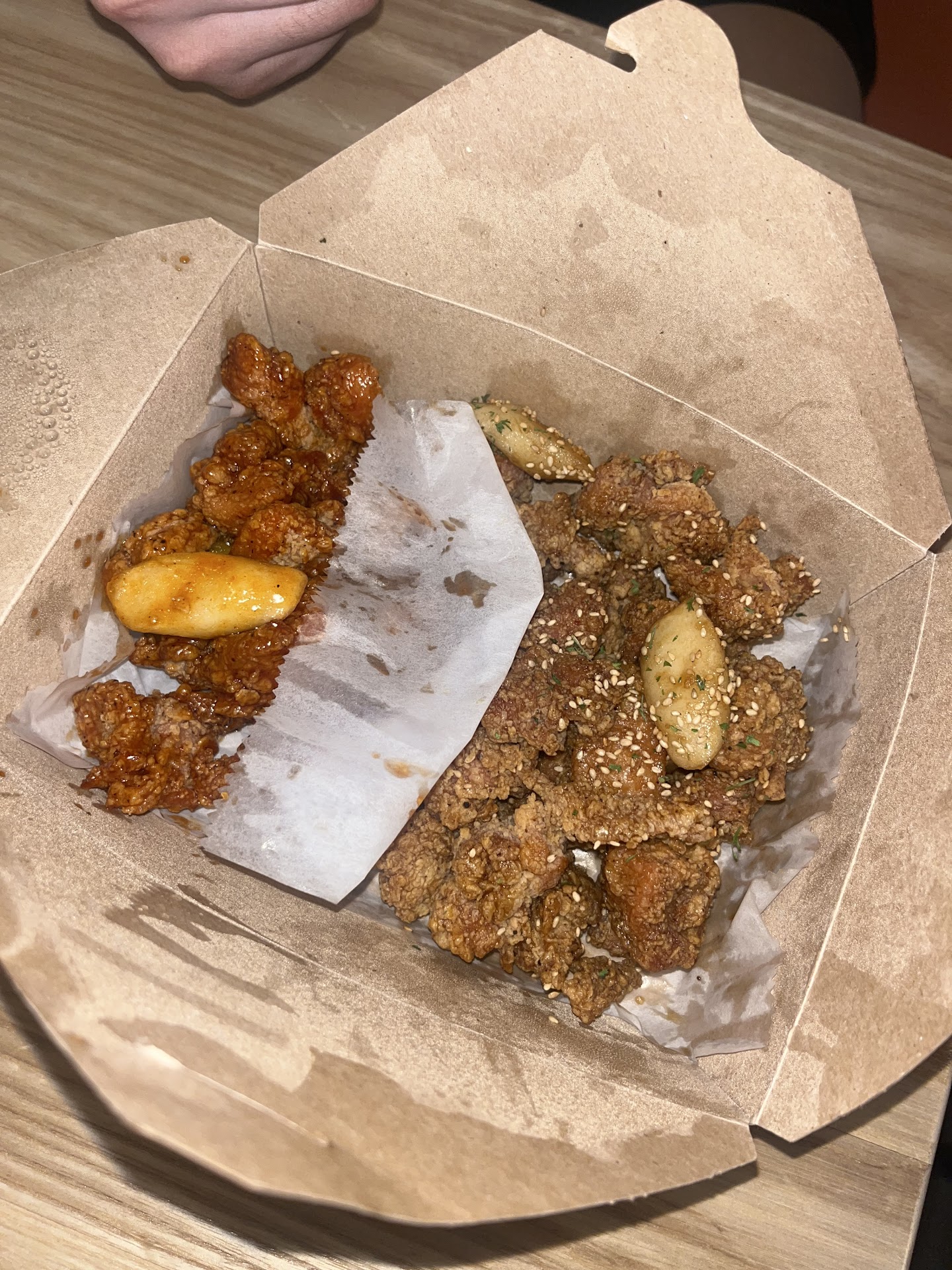 Amount of food is so nice- a lot even for the medium wings. Our favorite flavor was the “Yangnyeom”- which has gochujang and other ingredients like peanuts- perfect balance of crunch, sweetness and spice. We also got a bowl with soy garlic sauce and wings with bbq but we didn’t like those as much.