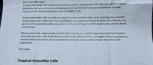 This is an update to my review made two months prior. I apologize for the delay taken to update my review, in accordance with measures taken to resolve my complaint. After I posted my review on Tropical Smoothie business page and BBB, I received a voicemail and follow-up call from the manager personally. They expressed one of the staff present were new and still in training; I acknowledge and understand, as it pertains to the speed of service. Nevertheless, the manager stated I may receive a full refund, and a fresh smoothie made by them personally. I was very pleased with their response to my complaint, and explained I would update my review accordingly; however, I was unable to come in and obtain a newly made smoothie, due to unforeseen circumstances. They then went above and beyond and sent the attached letter and gift card to redeem at a later date. Please see the attached. I cannot express the level of customer service displayed and strongly encourage others who have left complaints, to return and update their reviews if an attempt to resolve their complaint, was addressed like mine. Thank you Tropical Smoothie.