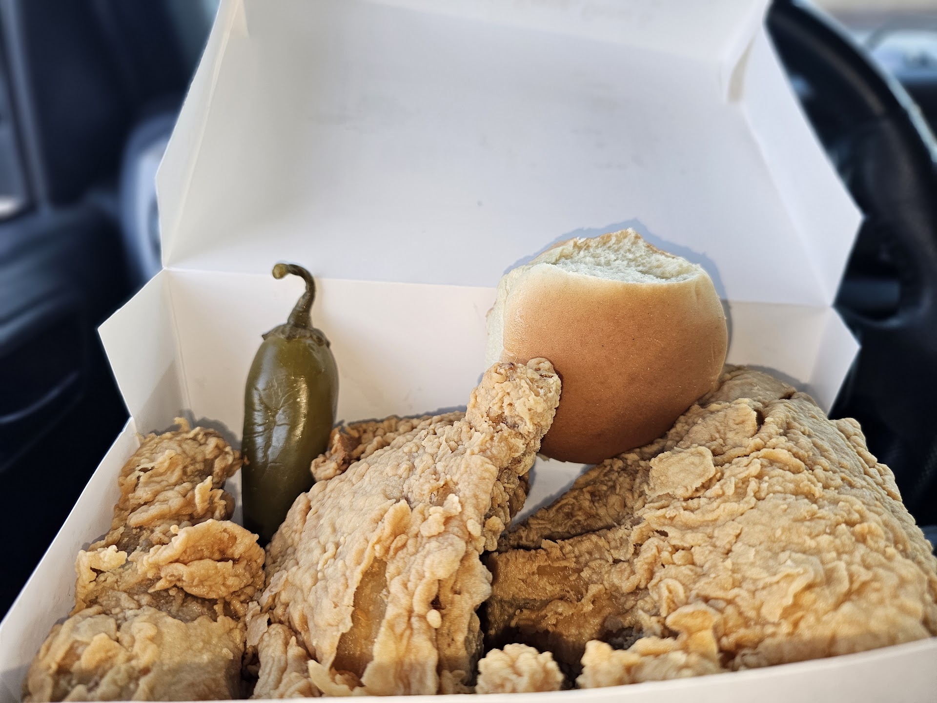 I stopped by on a whim while driving home. First thing I noticed was the drive up menu which was quite faded and ancient looking. I don't hold this against them per se, as I usually find it to be a good sign when choosing Chinese restaraunts. It was weird to see it in a drive through though. I ordered the #5, three piece mixed white and dark. I got two breasts and a thigh, a biscuit, fries, a JalapeƱo and a drink for $13 and change. The staff working the drive through were nice enough; no complaints on the service and I didn't wait long for my food. First thing I noticed about the chicken was the pieces were noticibly quite larger than you see at chain chicken places like Popeyes or KFC these days. Reminded me of what you would've gotten from a chain place back in the late 1980's or early 90's. The chicken was a little pale. Good crunch, but not as flavorful as I'd have liked. Biting the end of the jalapeƱo off and putting some juice on the chicken definitely helped. The crinkle cut fries were soggy, undercooked, and kind of sad really. Crinkle cut fries are probably the hardest to get right and when they're not cooked properly they're terrible. That was the case here. Ideally you want them to be a little translucent. These were a pale yellow. The roll was as plane Jane as they come. Fine I guess, but had they included a small amount of butter it would've gone a long way. There are definitely better options around for fried chicken. I look forward to...