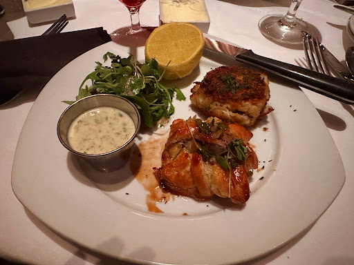 The food was AMAZING; for an appetizer I had the crabcake with lemon aioli and the mini beef wellington. The crabcake was delicious; if I had to make one recommendation for improvement, I'd recommend that they impart more flavor into the mini beef wellingtons. They were on the bland side as they did not have duxelles (or anything else) between the meat and pastry for flavoring. They were still tasty, just not as flavorful as I like my beef wellington to be. My main course (filet mignon Oscar Style) was one of the best I've ever had (pictured below with the yellow bearnaise sauce on top). They used Dungeness crab, (which is my favorite being from Oregon), and the asparagus was perfectly cooked al dente with a slight amount of crunch. The bearnaise sauce that covered it all was flavorful and tangy, and the mascarpone mashed potatoes melted in my mouth.