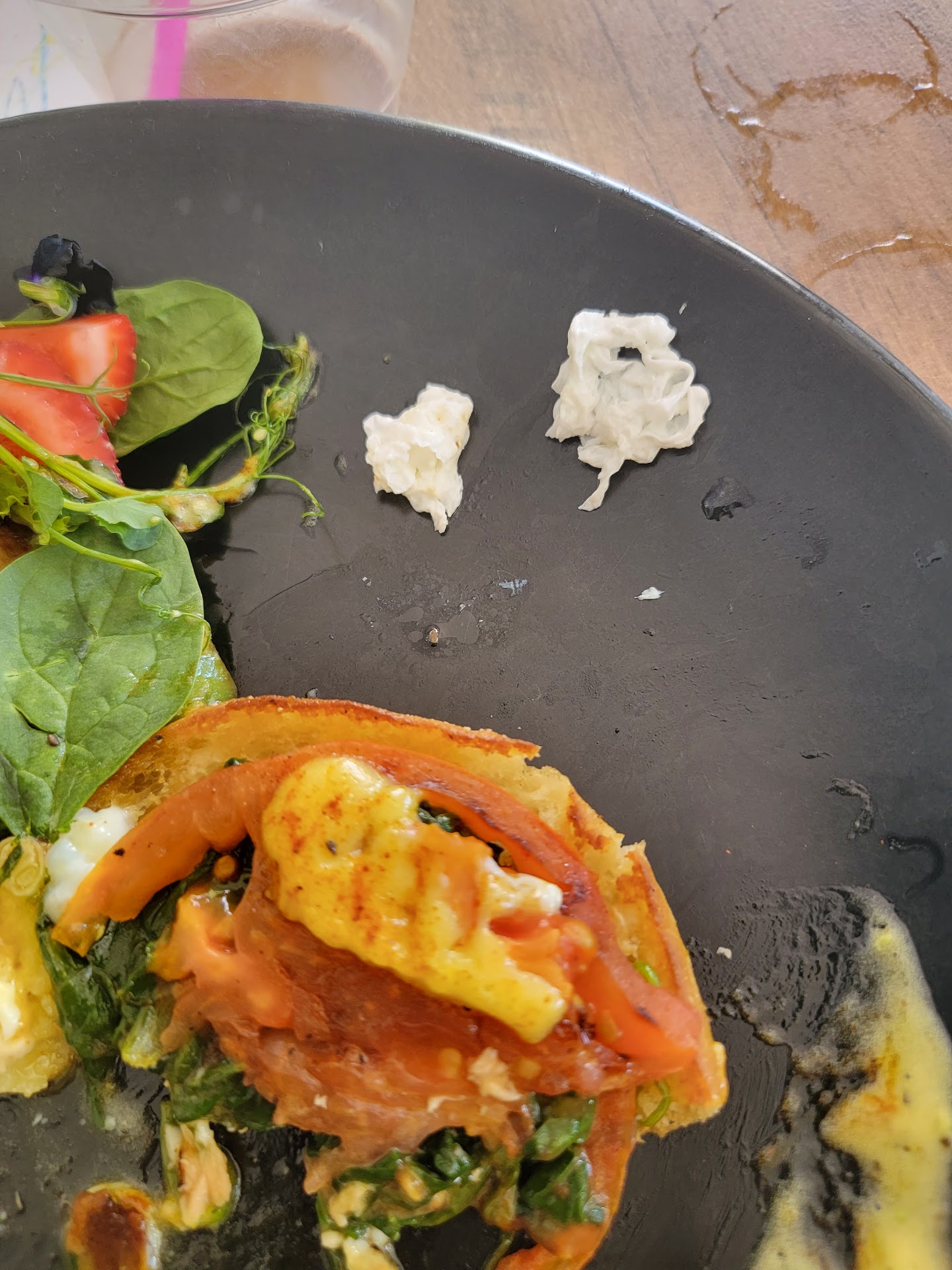 Read moreThe restaurant looks great on the inside, a little niche modern joint. We were seated nearly immediately, and our order was taken shortly after. We then proceeded to wait an hour for the food, in which case there was a single refill of water offered to me. I ordered the Salmon Benedict. I tore into the egg and the first muffin without a problem. When I scooted the second muffin across the plate I noticed an oddly textured and colored item that crumbled apart had come off the bottom of the muffin. I thought "Maybe it is egg white" but when I tasted it, I tasted paper. Had the wife taste it, and we both concluded it was likely napkin of some sort.