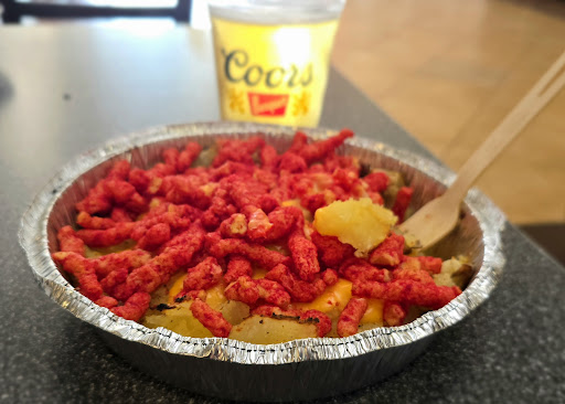 Now the foodâŚ.. HOT DAMN!! Big portions, delicious potatoes and amazing options! I got the pizza potato and my friend got the buffalo chicken potato. SO GOOD!!! Keep in mind, these are fresh from the oven, so the container itself is fairly hot, so use caution when getting it out of the bag.
