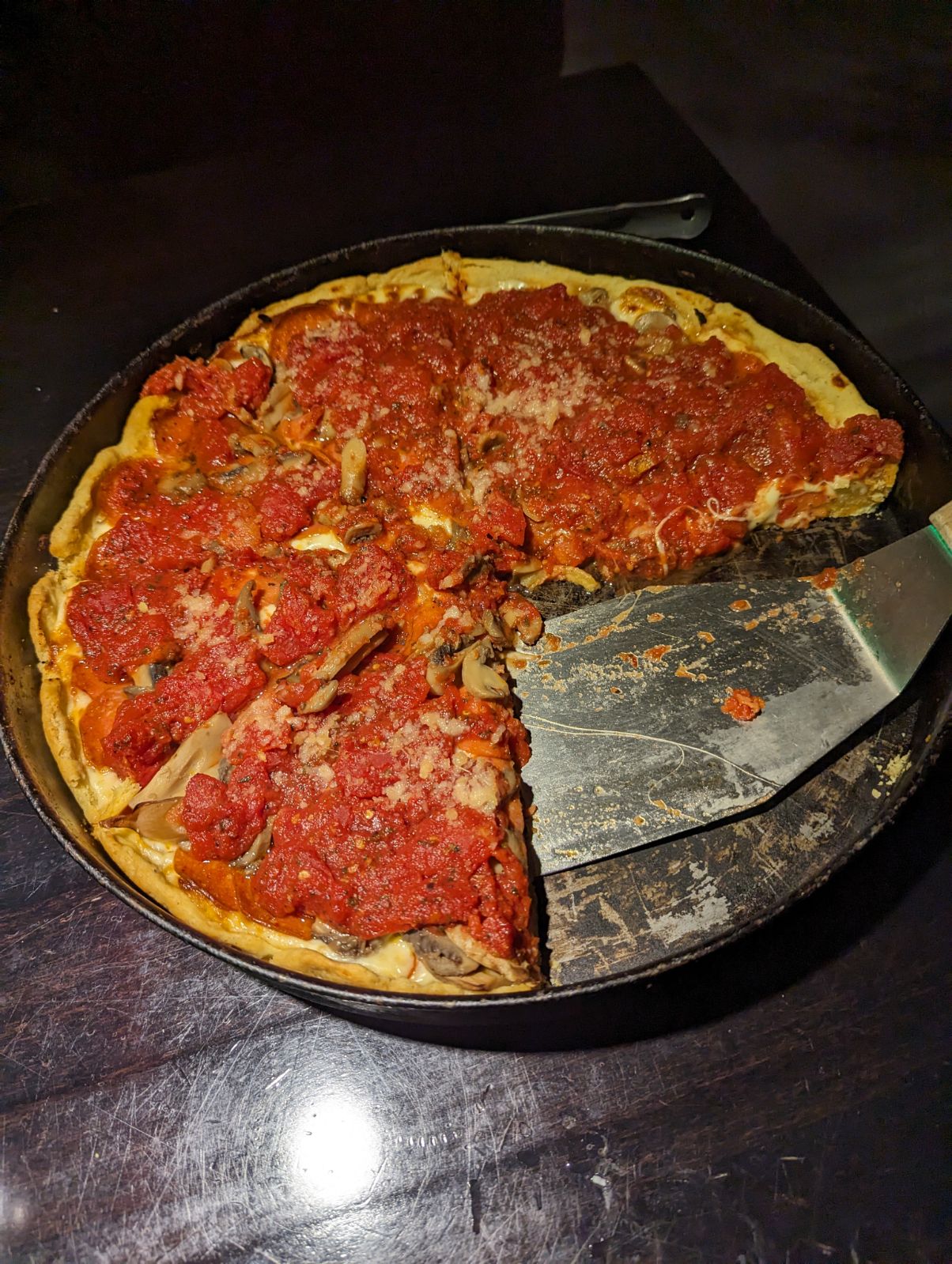 I like deep dish pizza period, but true Chicago style is different. The crust needs to be slightly crispy and flakey, but not too crisp and not falling apart flakey. There also needs to be just a hint of sweetness in the crust, but not too sweet. There needs to be sauce, but also hunks of tomato's and plenty of flavor. This place got it right in all areas.