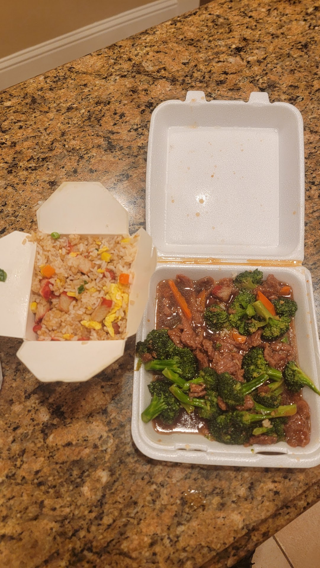 Got home (only around the corner), and I have to tell you. The only thing worse than the service...IS THE FOOD... this order is terrible. The broccoli is flavorless, super soggy, only to be upstaged by the beef, of which I wouldn't serve my Mastiff. It's like it's pure fat trying to be disguised as beef... didn't have the consistency of beef...hard to explain, but certainly the worst Chinese Food I have ever had in my life. If that wasn't enough, my knees are shaking at this point, as I open the pork fried rice package. I could tell I was the first one to order it that day because every third piece of rice was hard and discolored, like it had been sitting in the warmer all day, and no one turned it over. I take a bite and literally spit it out... I have never said this before, and I may go to hell, but Taco Bell is literally next door and has far...