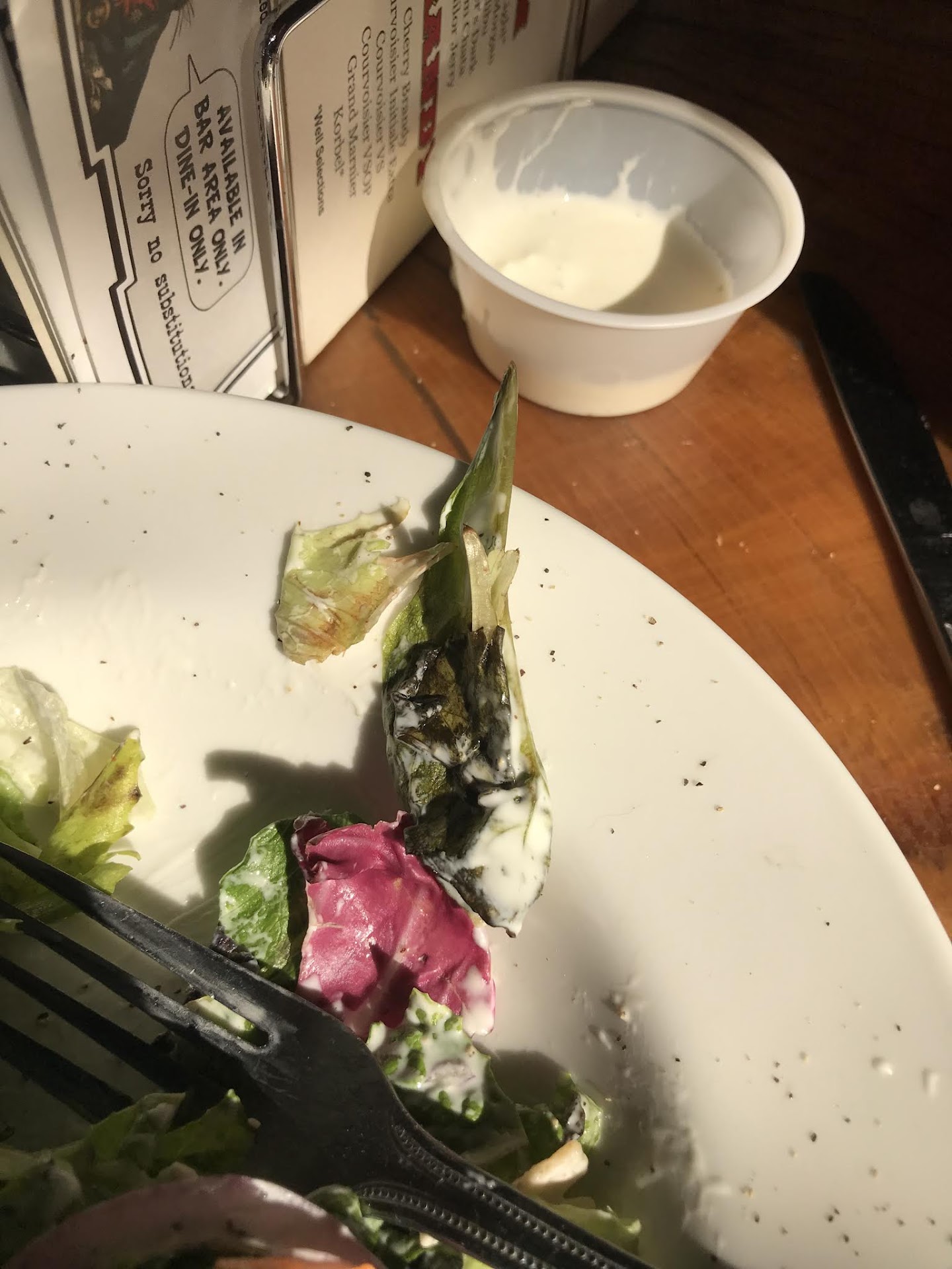 All the other components were delicious. The bacon well-cooked and tasty. The cheese, nice and creamy. The peanut butter and barbecue sauce absolutely delicious and the fried onions were fantastic. The lettuce and tomato nice and fresh. Everything went together well except for those two big pieces that just did not do it for me.