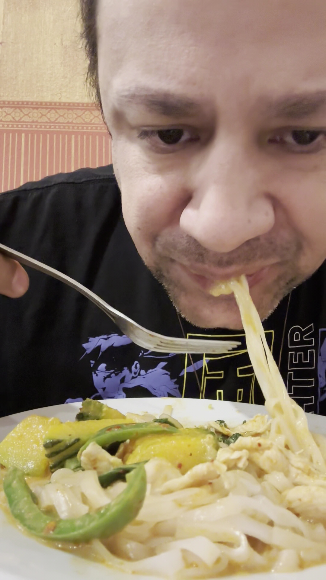 Let’s start with the food. I ordered the pumpkin curry with chicken, and I asked for it with a level five spice. Let me tell you, it was a flavor explosion—nuclear heat that hit hard but was perfectly balanced by the creamy coconut milk and the fresh, fragrant basil. It wasn’t just spicy for the sake of it; it had depth, richness, and soul. Honestly, it was one of the best curries I’ve had in years. I tried to mix it up by asking for rice noodles instead of the usual rice, and they nailed it. The noodles were the perfect vehicle for soaking up all that delicious sauce.