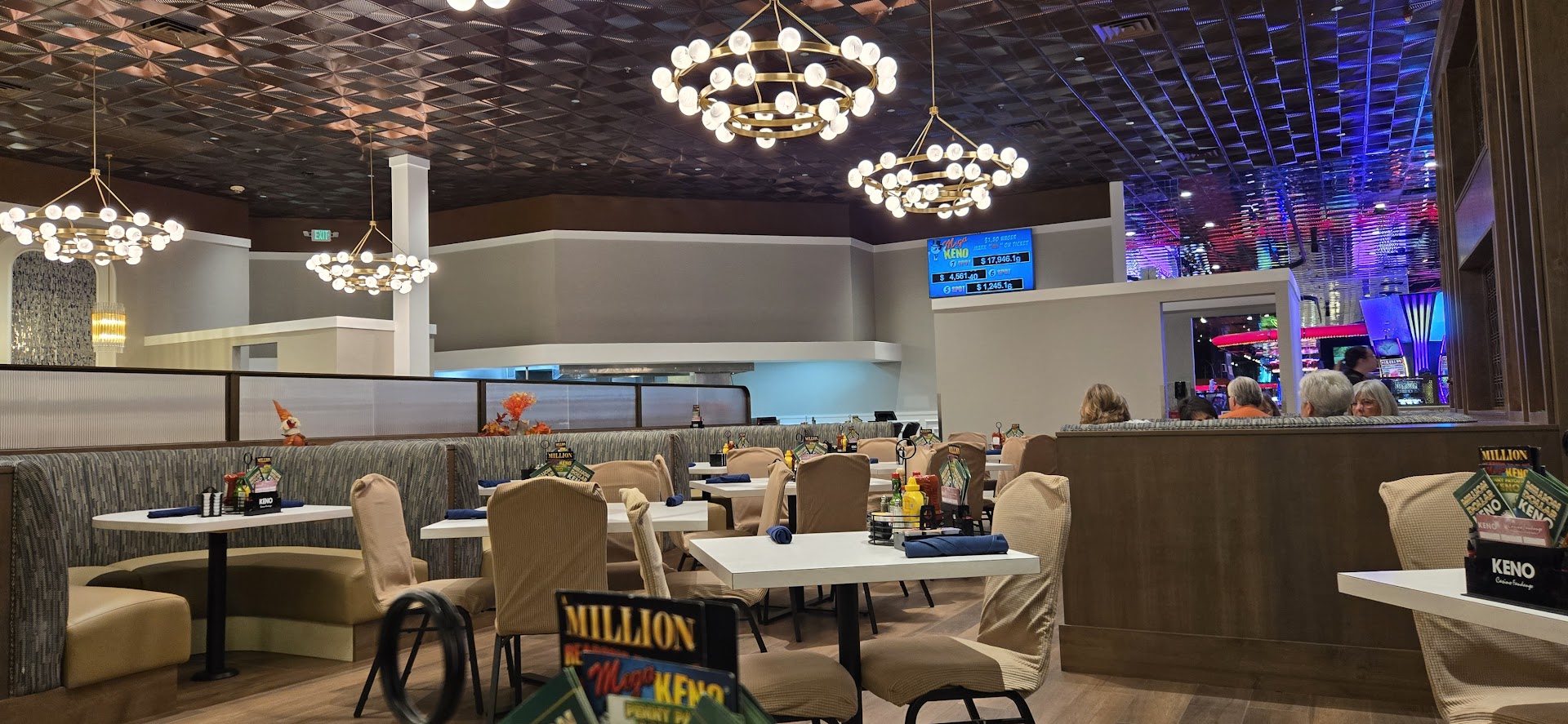 I have to say that I'm a little disappointed to give this place 3 starts being that I was really hoping to give it a much better review. Ever since it got remodeled, my wife and I had been wanting to dine here especially being that they did such a nice job of updating the place and making it look so modern. It really is a HUGE improvement over the 1980s tropical theme thing they had going. Unfortunately, our first visit was right after they opened but we didn't stick around because there was such a long line to get in and with what seemed like nobody around to seat people. At the time, we just chalked our experience up to being just growing pains and so we made an effort to come again. When we finally came back just recently, we got seated quickly and received nice, fast and friendly service and that was all great but I'm disappointed to say that the coffee tasted more like weak tea than anything and the food was just, eh. My wife ordered the Smothered Hashbrowns with chili and I got the Pulled Pork Hash and while the price of both were quite reasonable, the portions were on the small side or at least for the hash and the taste of both were just okay at best. My wife's hashbrowns were old and really hard like they were cooked the night before and it was over all just really bland. My hash had more flavor but not any better than what you could get with some store bought BBQ sauce slopped on. I don't know, maybe it was just what we ordered and will have to give it another try but unless something they serve tastes better, I don't think we'll be coming here again. What a shame. Of course, if you like bland, I will need to reiterate that the food is reasonably priced and they do have Keno that you can play...