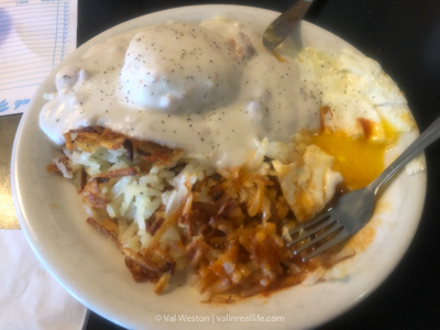 The food that came out was less than mediocre. The sausage was dry and was clearly held under a heat lamp to keep at temp or was just over cooked. The gravy was very bland, and seemed to be made from a store bought packet (just add water). The egg was not cooked as I ordered it and the syrup at the table was nearly as runny as water. Very disappointing food.