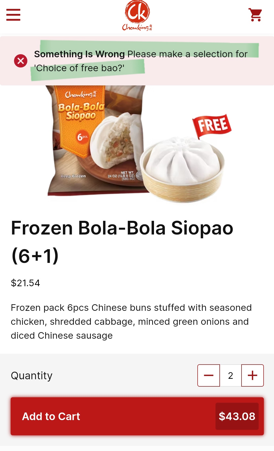 Your online ordering of frozen items are not working either on website or Doordash. The 6+1 free siopao choice is not popping so the order cannot be completed. This has been happening for a week until Monday Labor Day. I informed one of the staff & was told it will be addressed it to the manager but it is still not resolved.